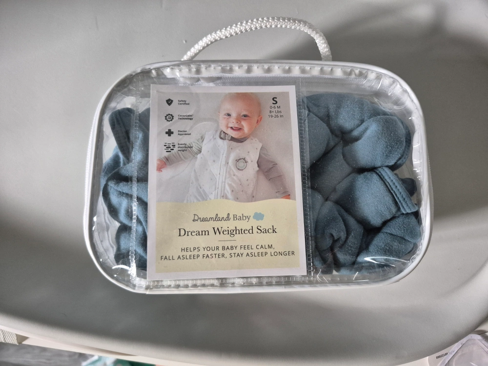 87Here's a Dreamland Baby Dream Weighted Sack in size small, suitable for babies 0-6 months or 8-16 lbs and 19-26 inches. It's designed to help your baby feel calm, fall asleep faster, and stay asleep longer. The sack is in great condition and comes with its original packaging!