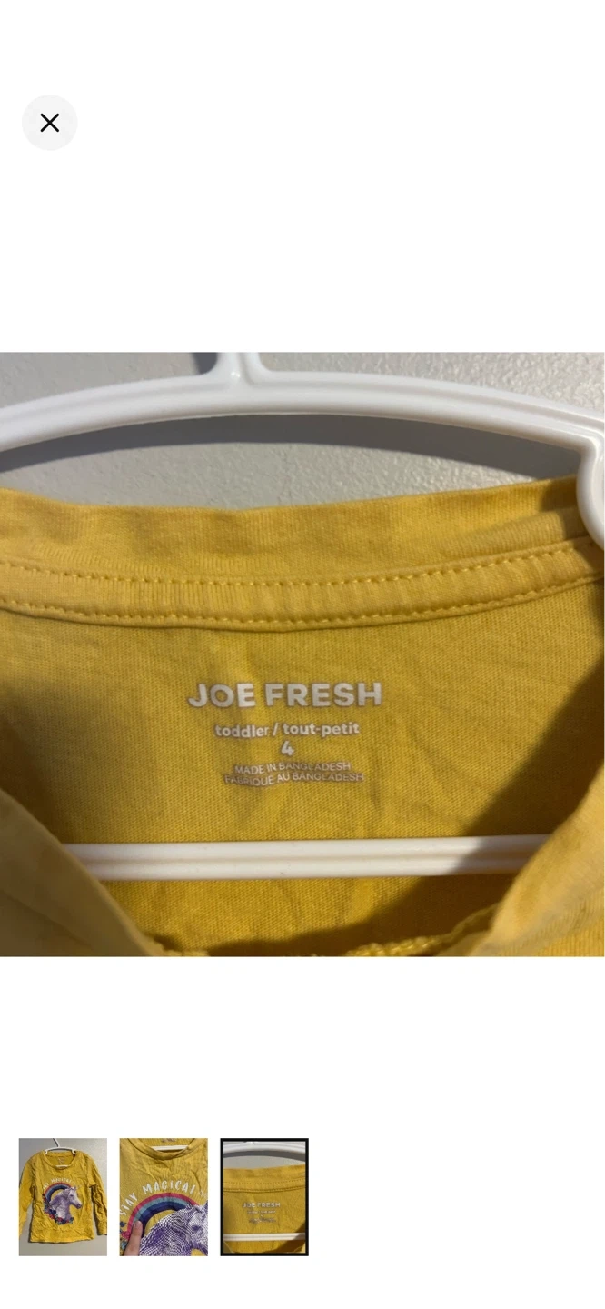 Joe fresh brand. Long sleeve graphic top. Yellow with rainbow unicorn print. Size 4t. Brand new condition $5