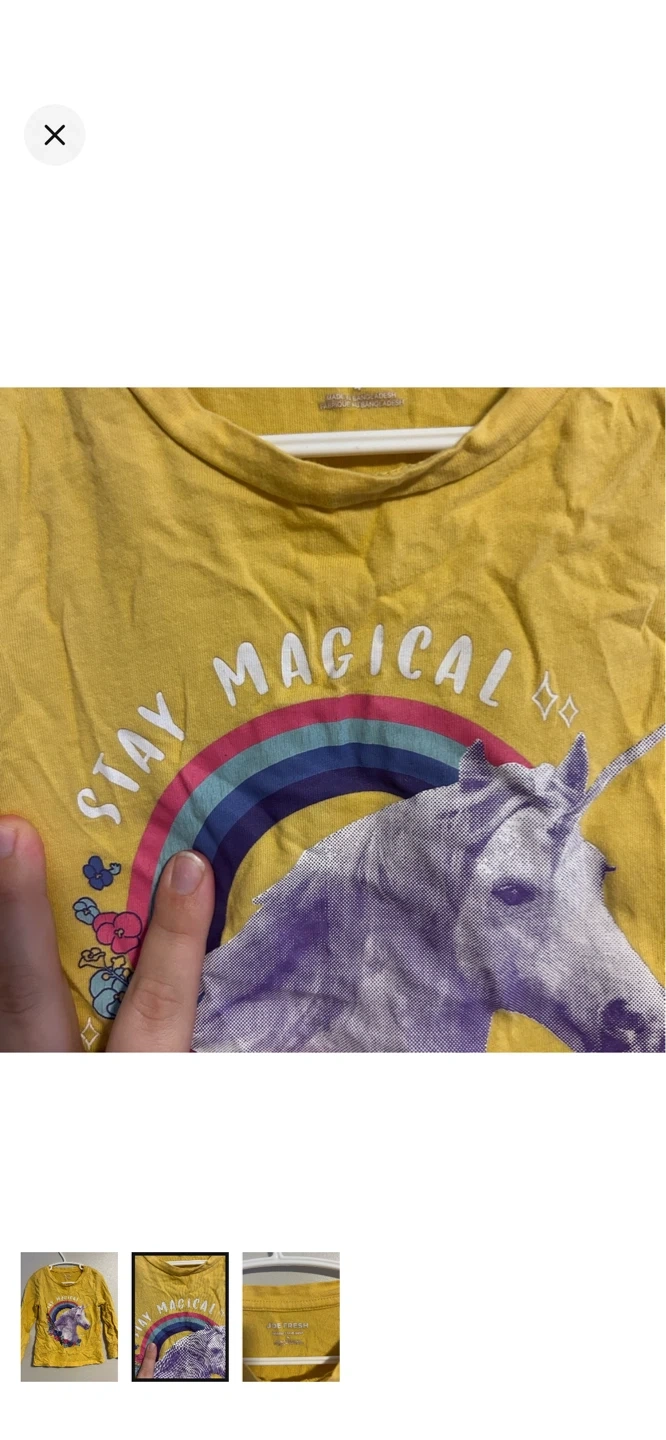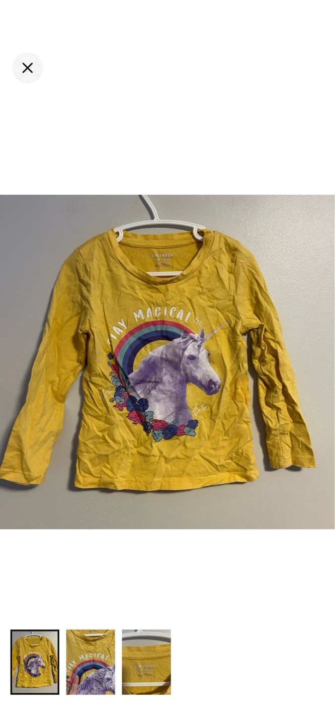 Joe fresh brand. Long sleeve graphic top. Yellow with rainbow unicorn print. Size 4t. Brand new condition $5