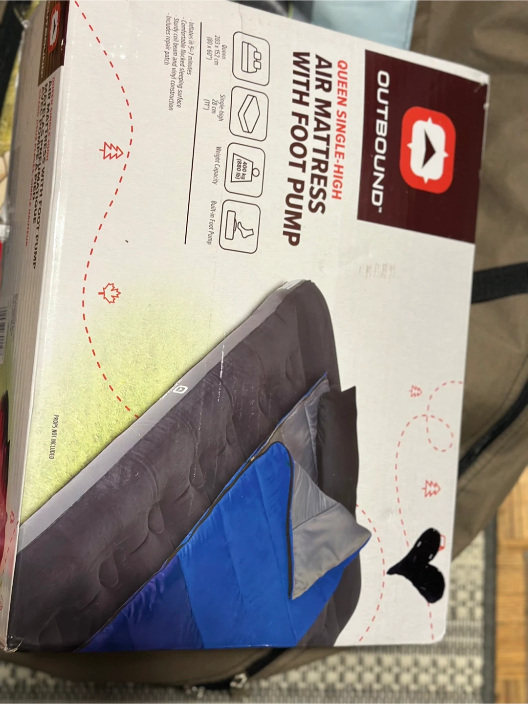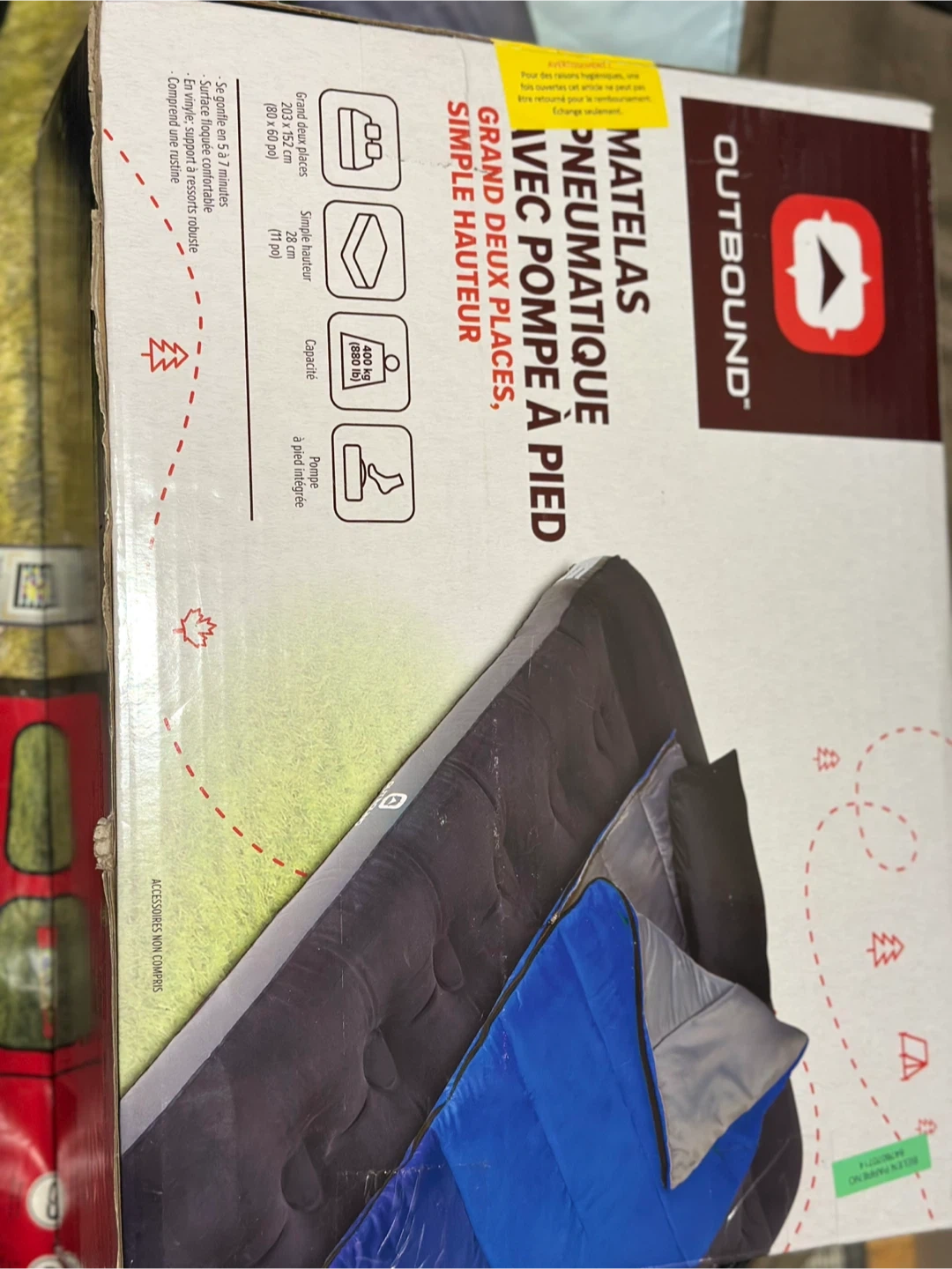 This Outbound double air mattress inflates in 5-7 minutes with its built-in foot pump. It features a comfortable flocked surface and a durable vinyl construction. It has a weight capacity of 400 kg (880 lb).