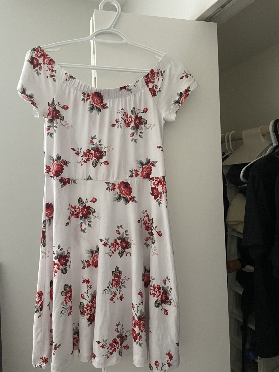 White dress (over-shoulder) with red/pink flowers. Very soft