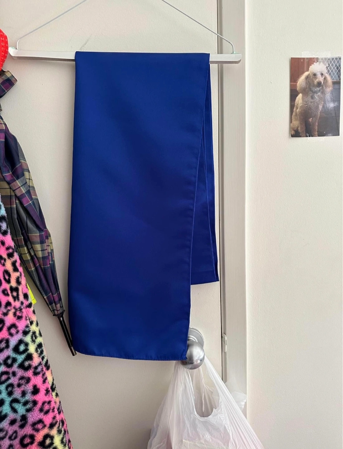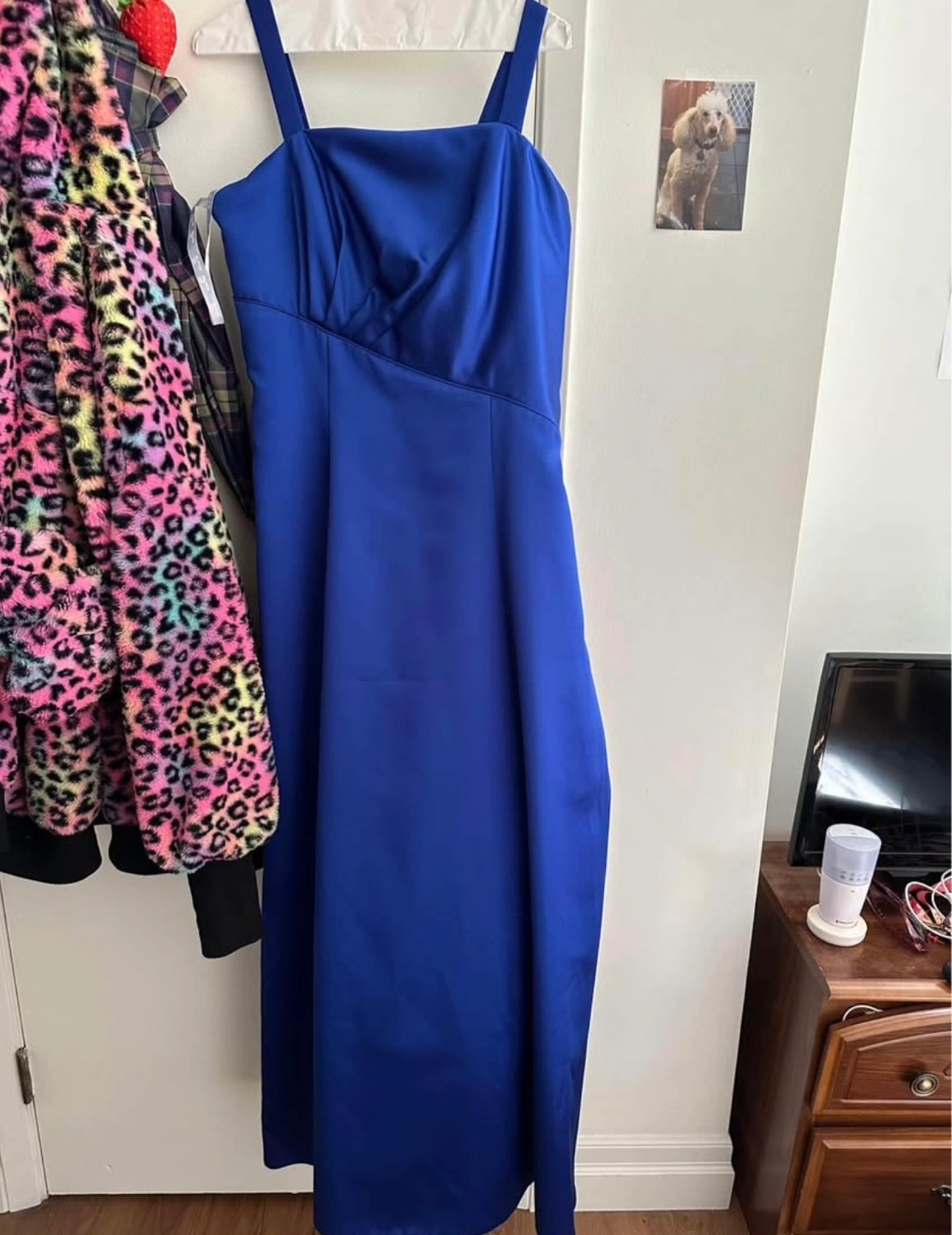 Long blue satin dress with straps. Simple and elegant style.