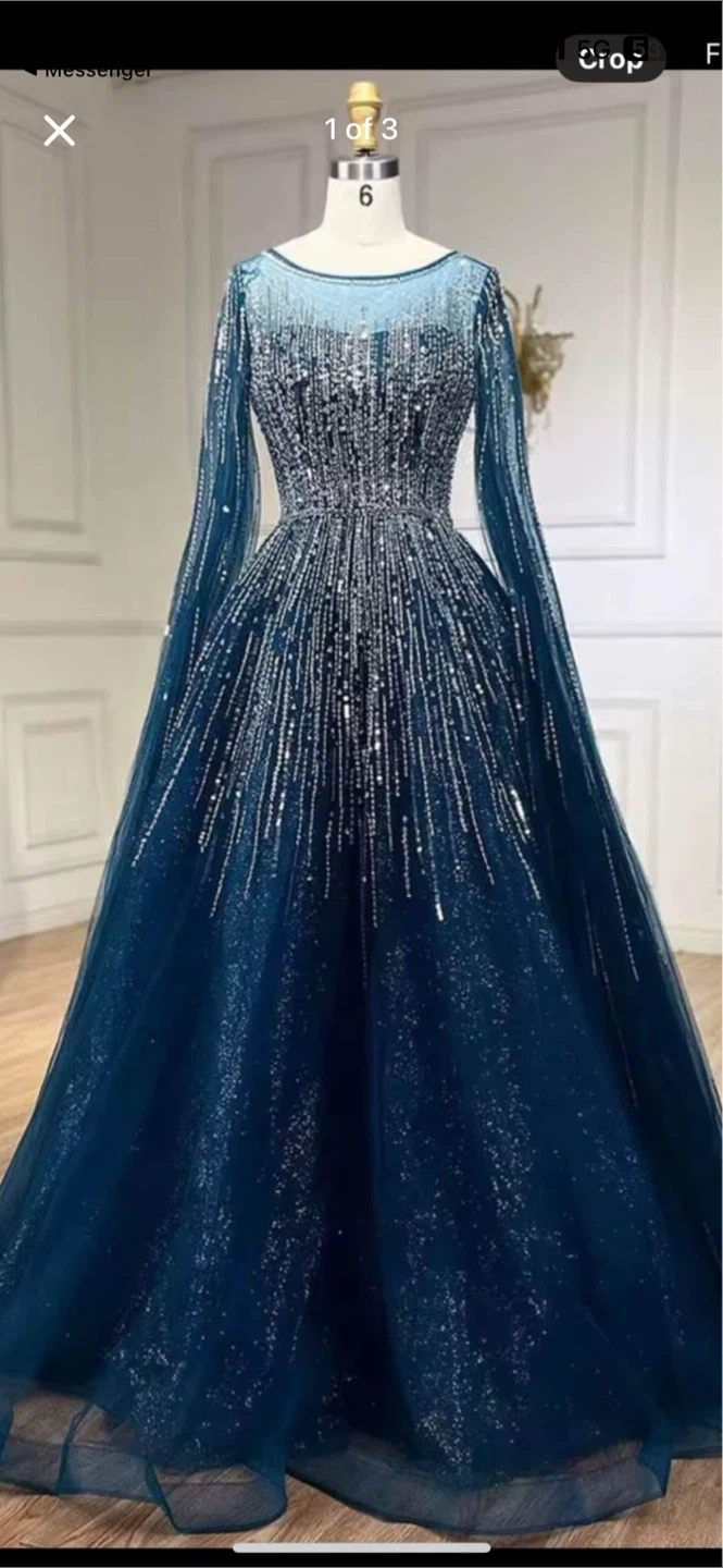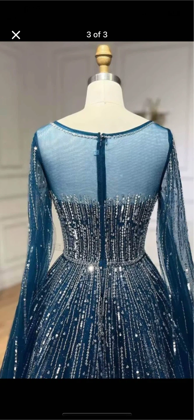 Beautiful blue evening gown with sequin detailing! This gown features long sleeves and a fitted bodice that flares out into a full skirt. Perfect for a special occasion or formal event!