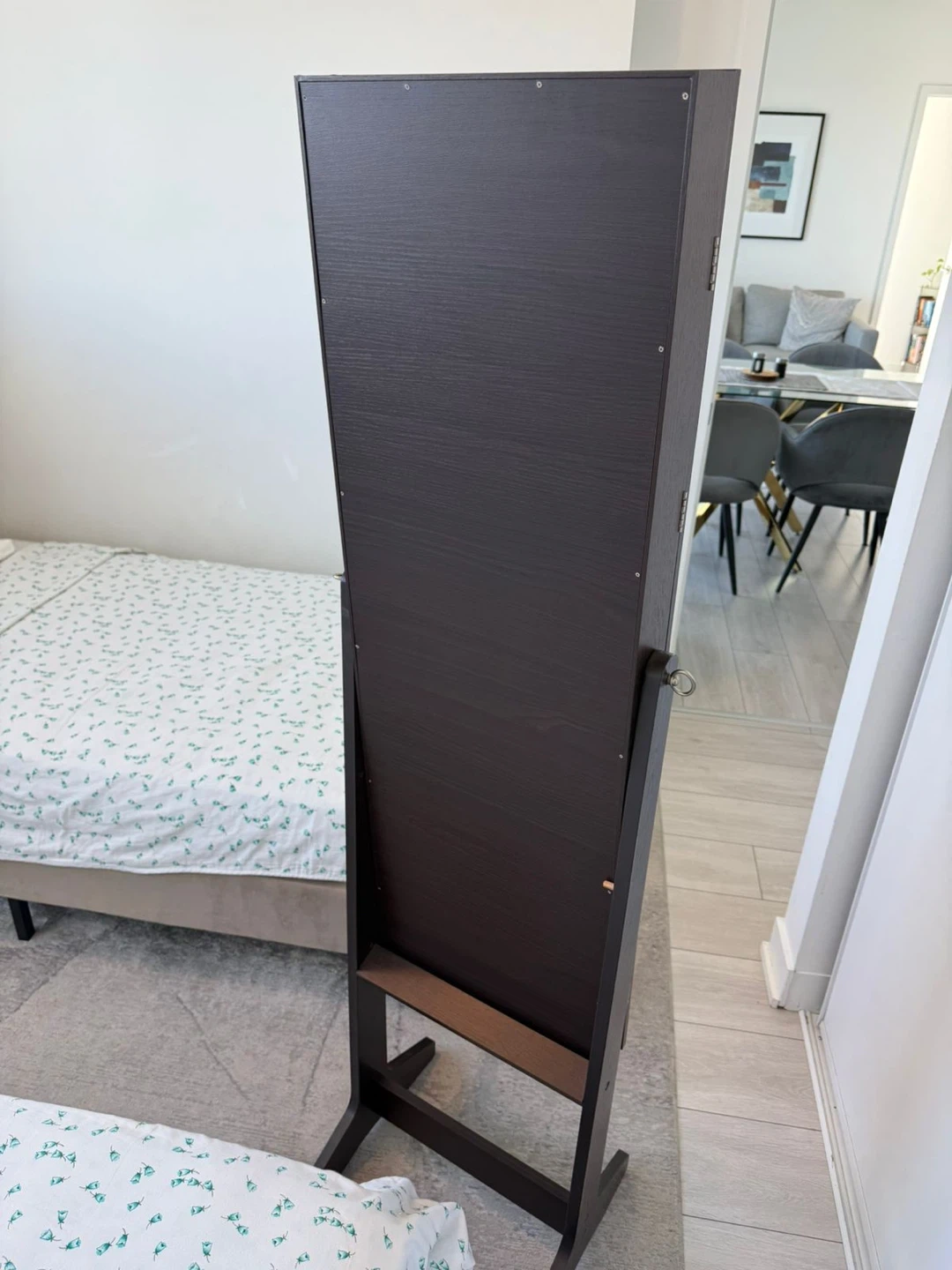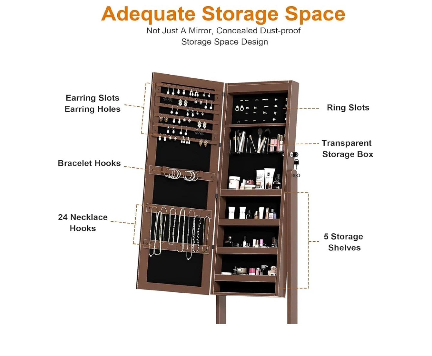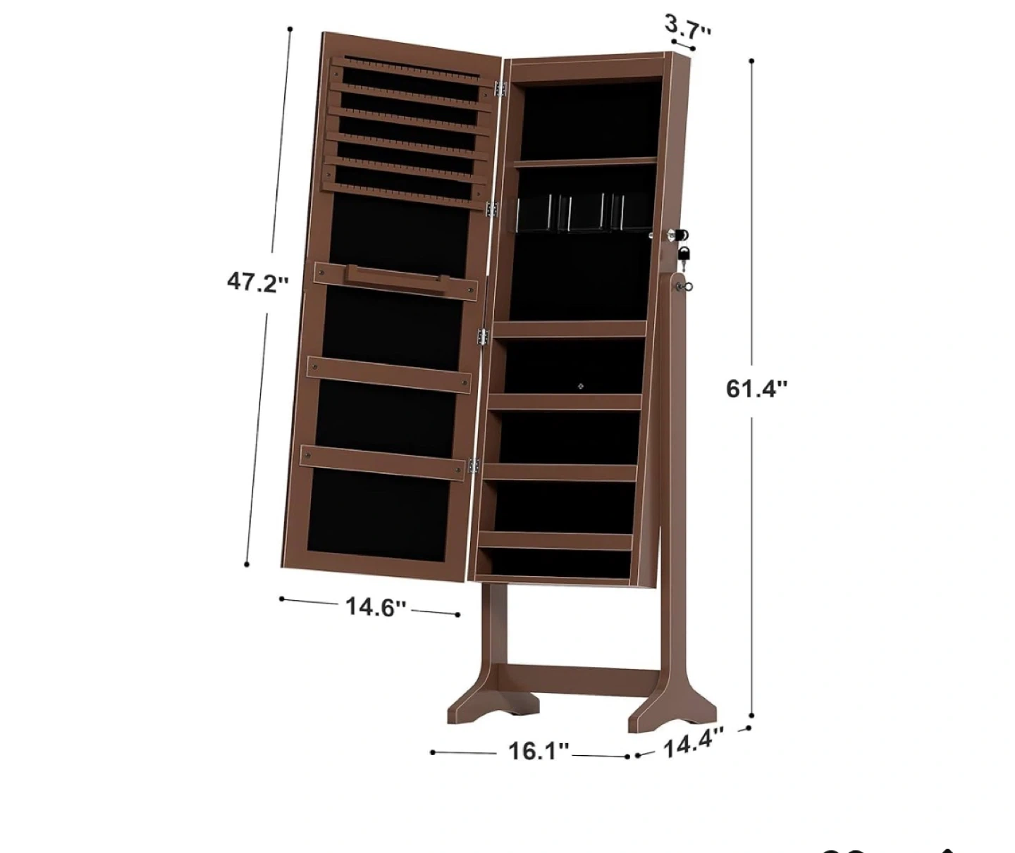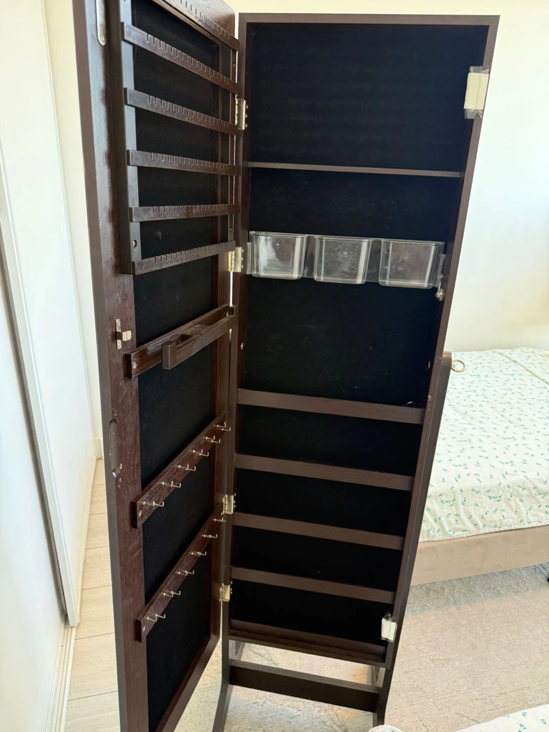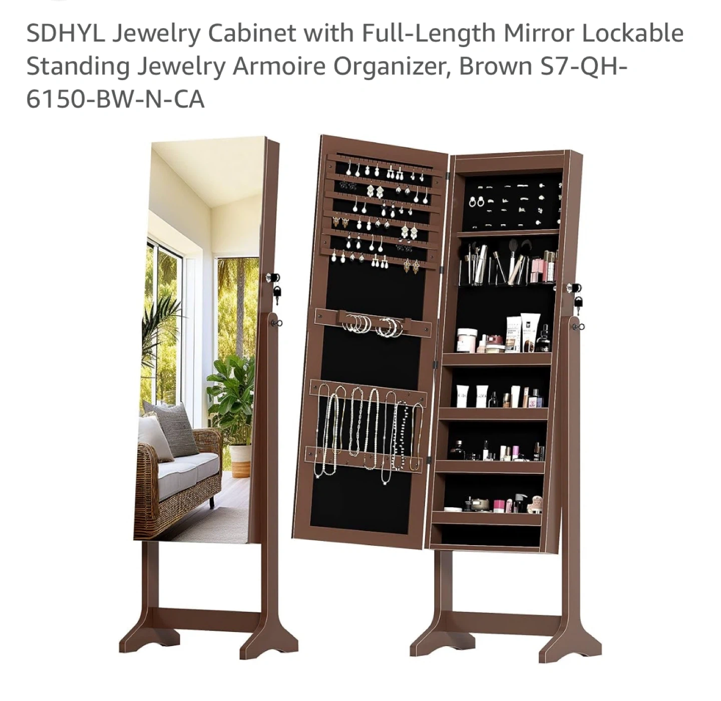 Selling a SDHYL jewelry cabinet with a full-length mirror! It's a standing jewelry armoire organizer in brown. It has earring slots, earring holes, bracelet hooks, and 24 necklace hooks. There's also a transparent storage box and 5 storage shelves. It measures 61.4" tall, 14.6" wide, and 16.1" deep. The mirror has a minor crack but not too visible.