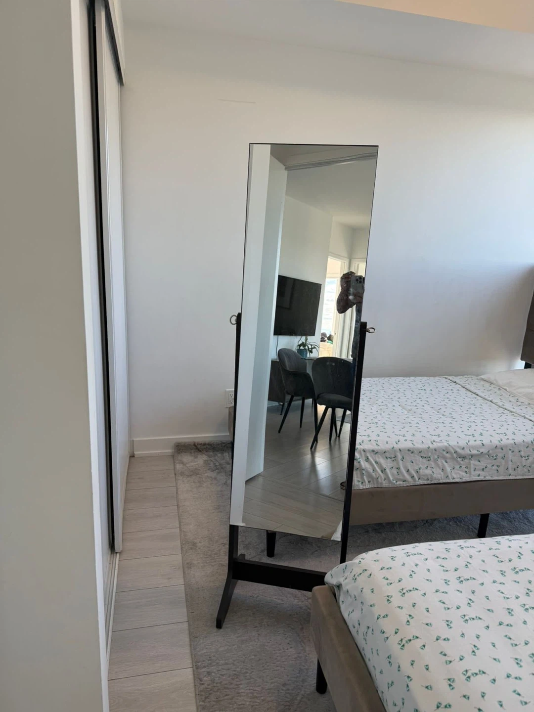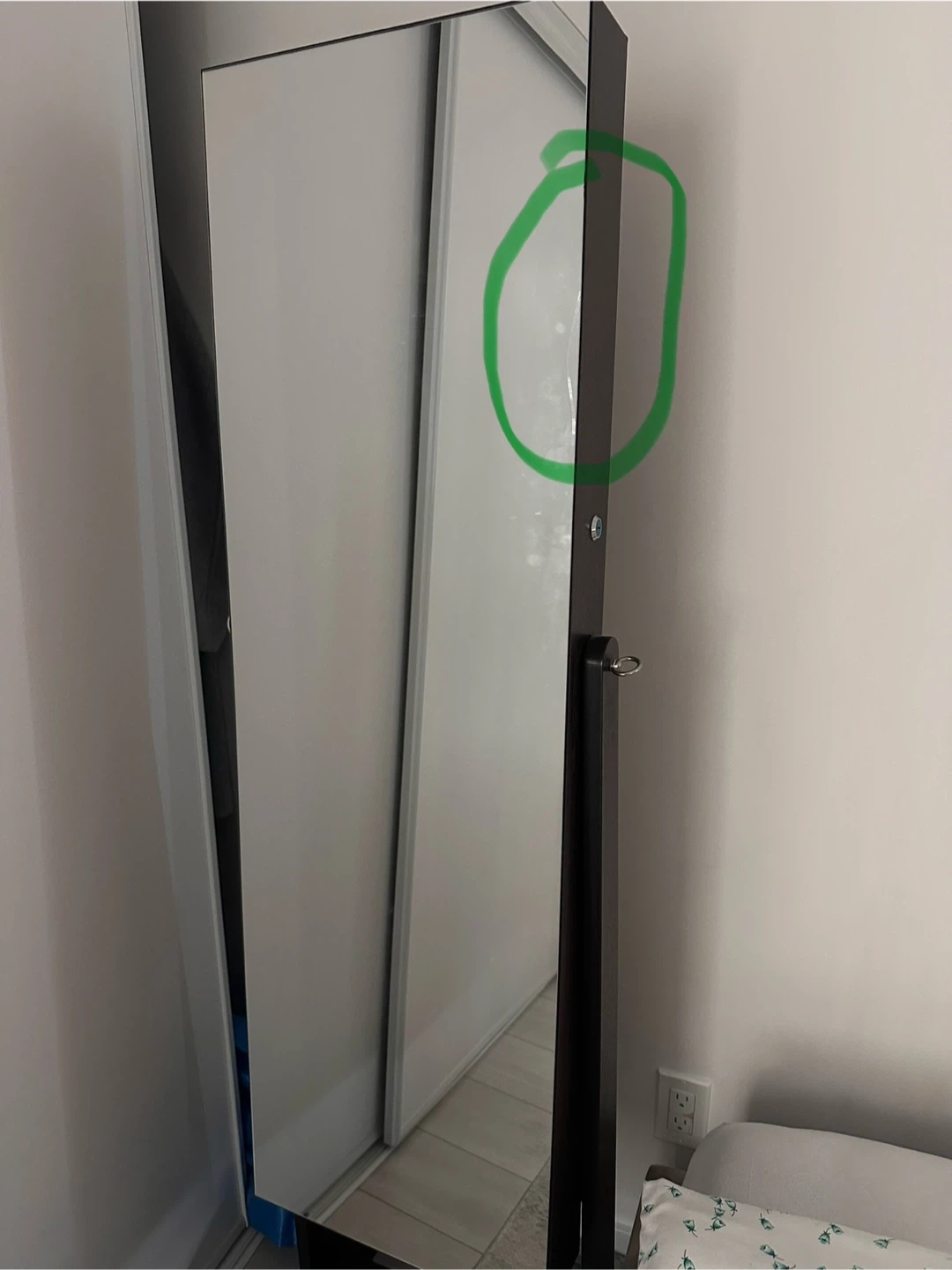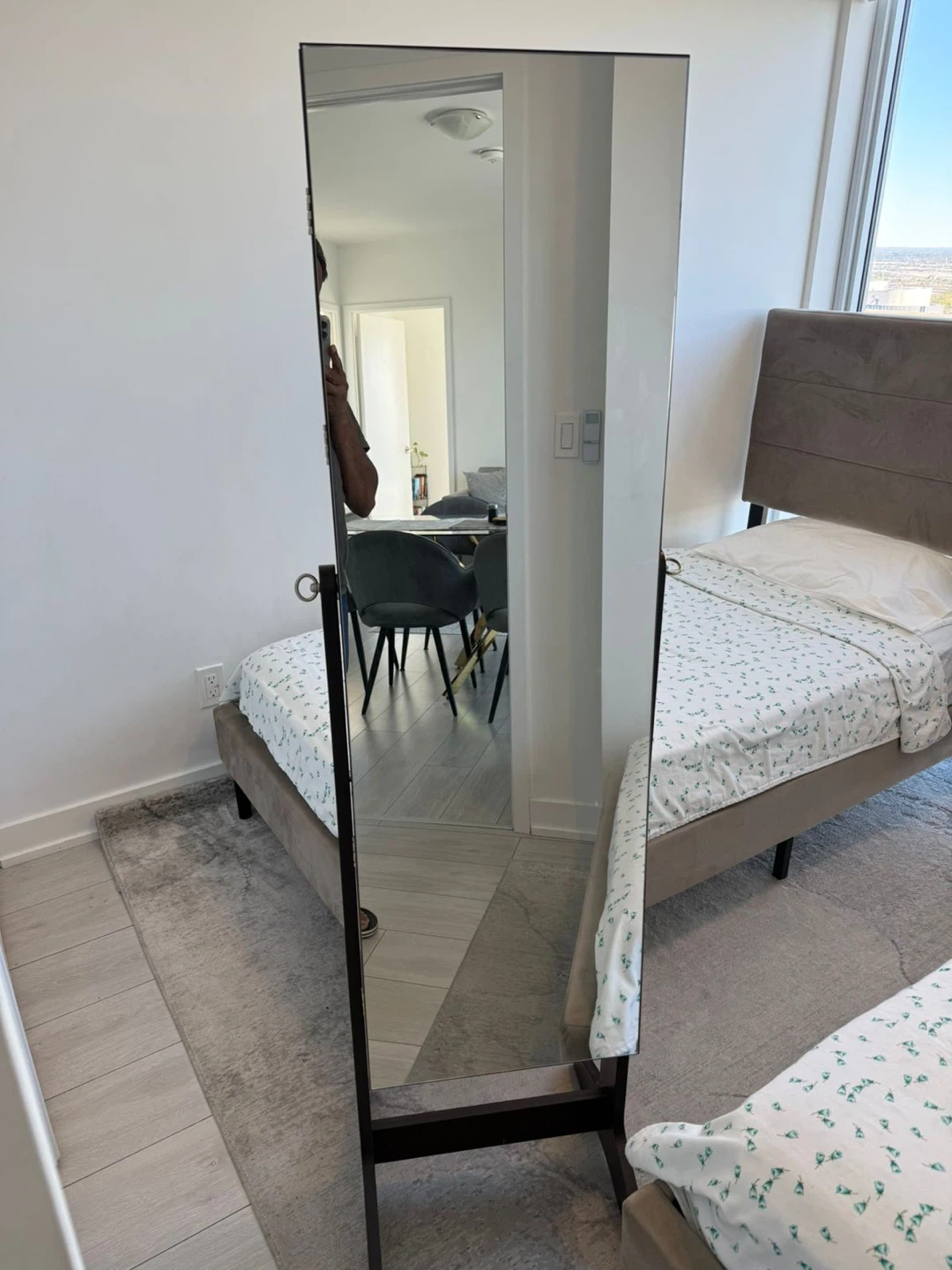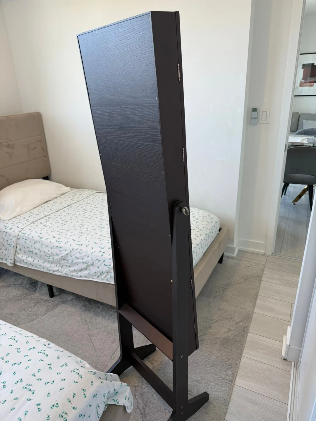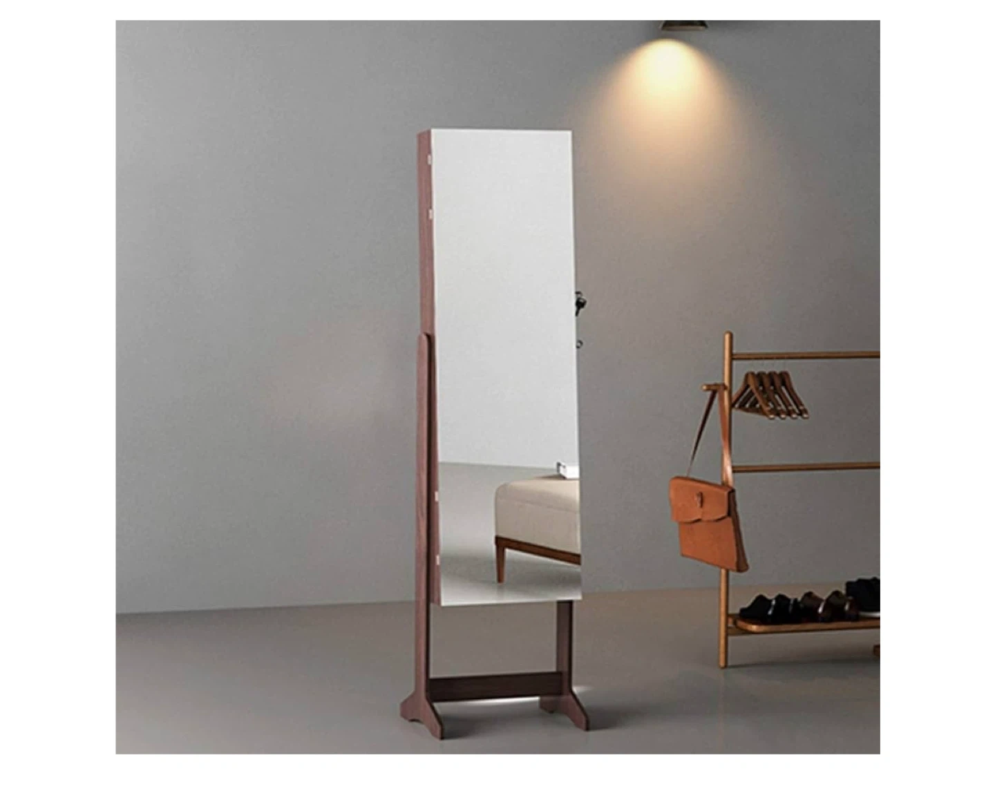 Selling a SDHYL jewelry cabinet with a full-length mirror! It's a standing jewelry armoire organizer in brown. It has earring slots, earring holes, bracelet hooks, and 24 necklace hooks. There's also a transparent storage box and 5 storage shelves. It measures 61.4" tall, 14.6" wide, and 16.1" deep. The mirror has a minor crack but not too visible.