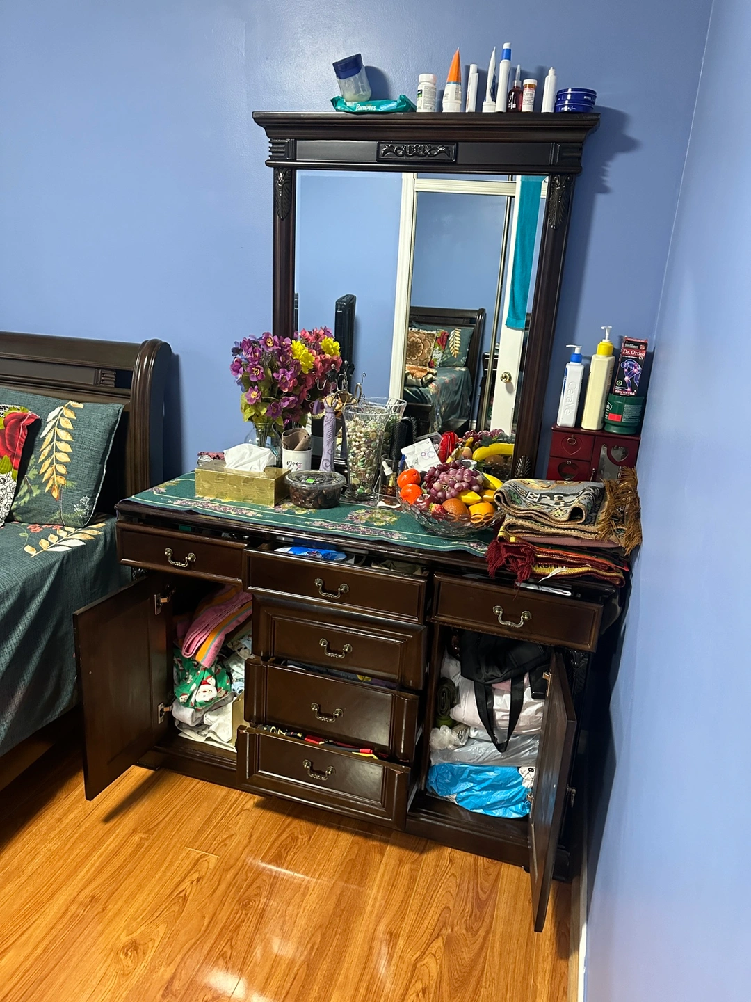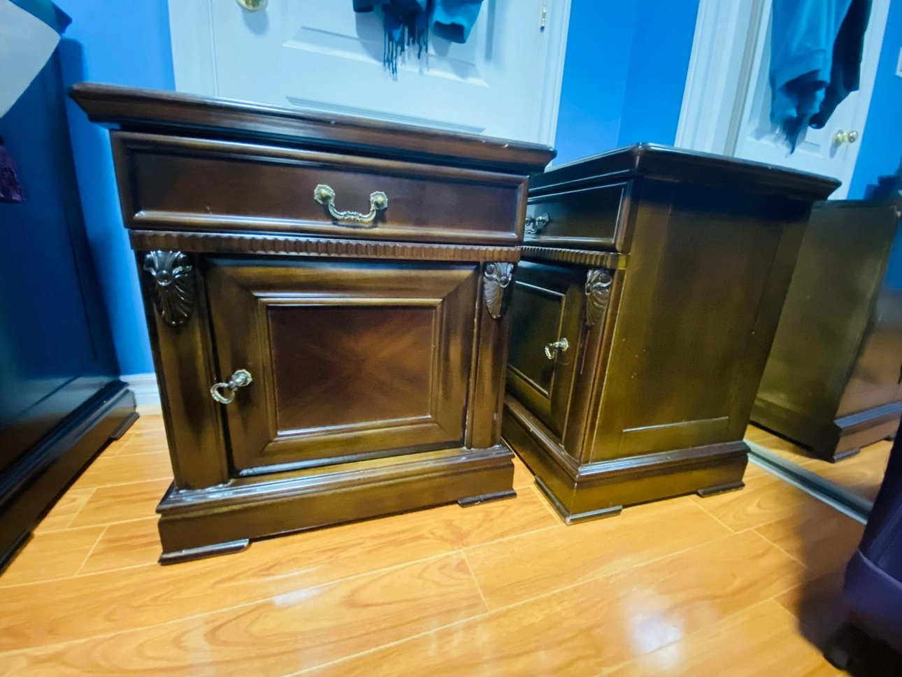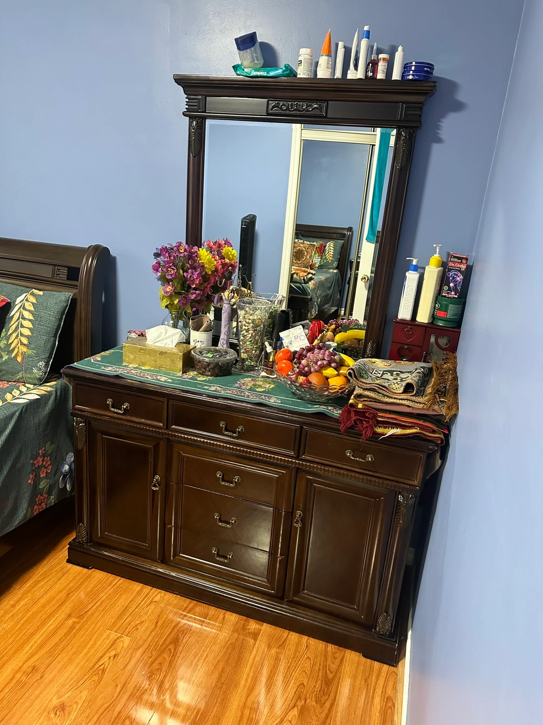 100Goreway/Brandongate 2 Night tables $150 22”W,16”D,23”H Dresser-mirror $180 51.5”W,20”D,32”H Queen bed $250 Solid wood firm prices A beautiful set of bedroom furniture. There is one dresser and two matching nightstands. The nightstands have one drawer each and a door. The furniture is in excellent condition with no scratches
