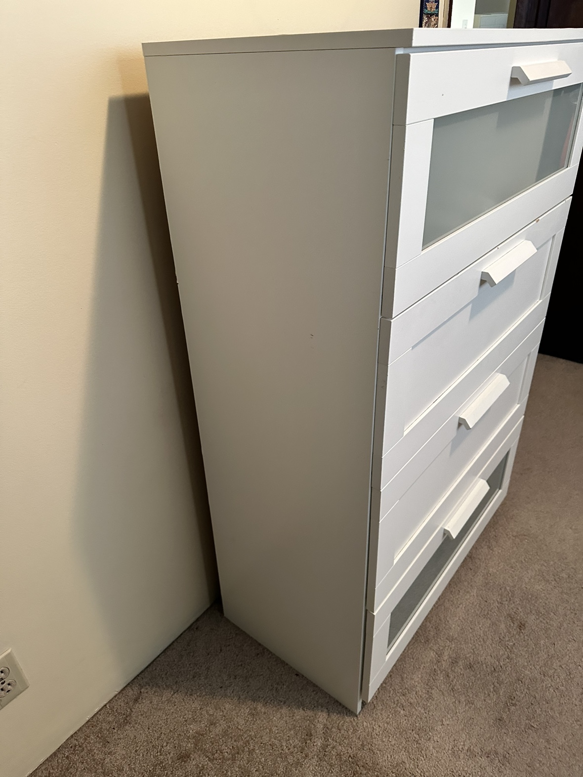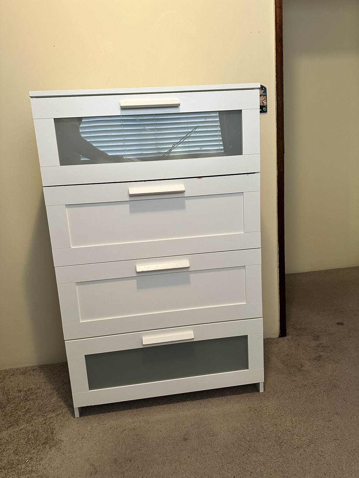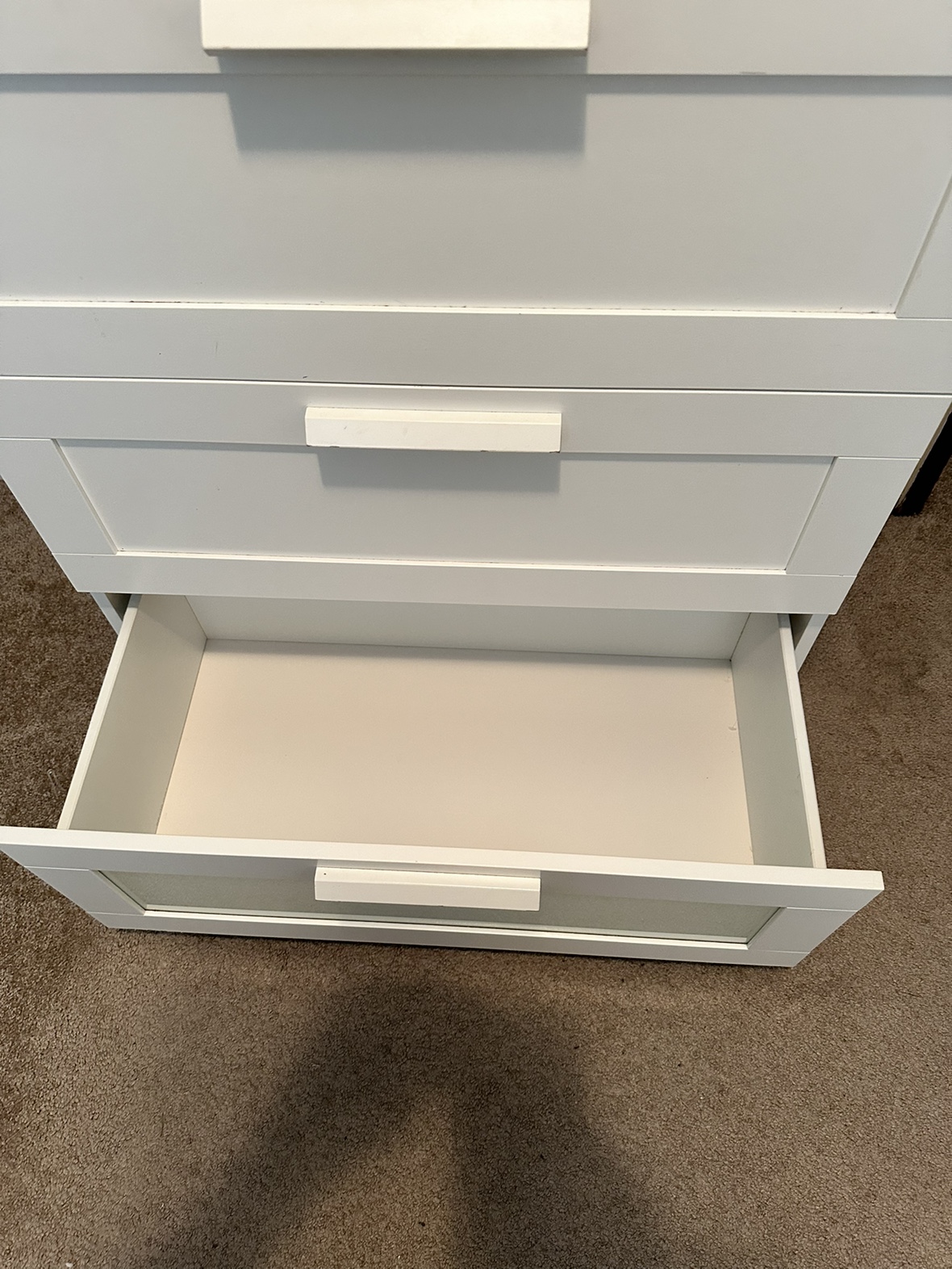 IKEA ( BRIMNES ) 4-drawer chest, white, 78x124 cm (30 3/4x48 7/8 ") 2 Frosted glass top drawer. (Ikea sells it with one glass drawer, we had 2 and this one is from the other one) CLEAN (no bad smell, no stickers, no markings) Good condition (may need some easy adjustments) Some minor dents and scratches that you do some easy touchups to it (see pictures) Paid $300 Selling for $45