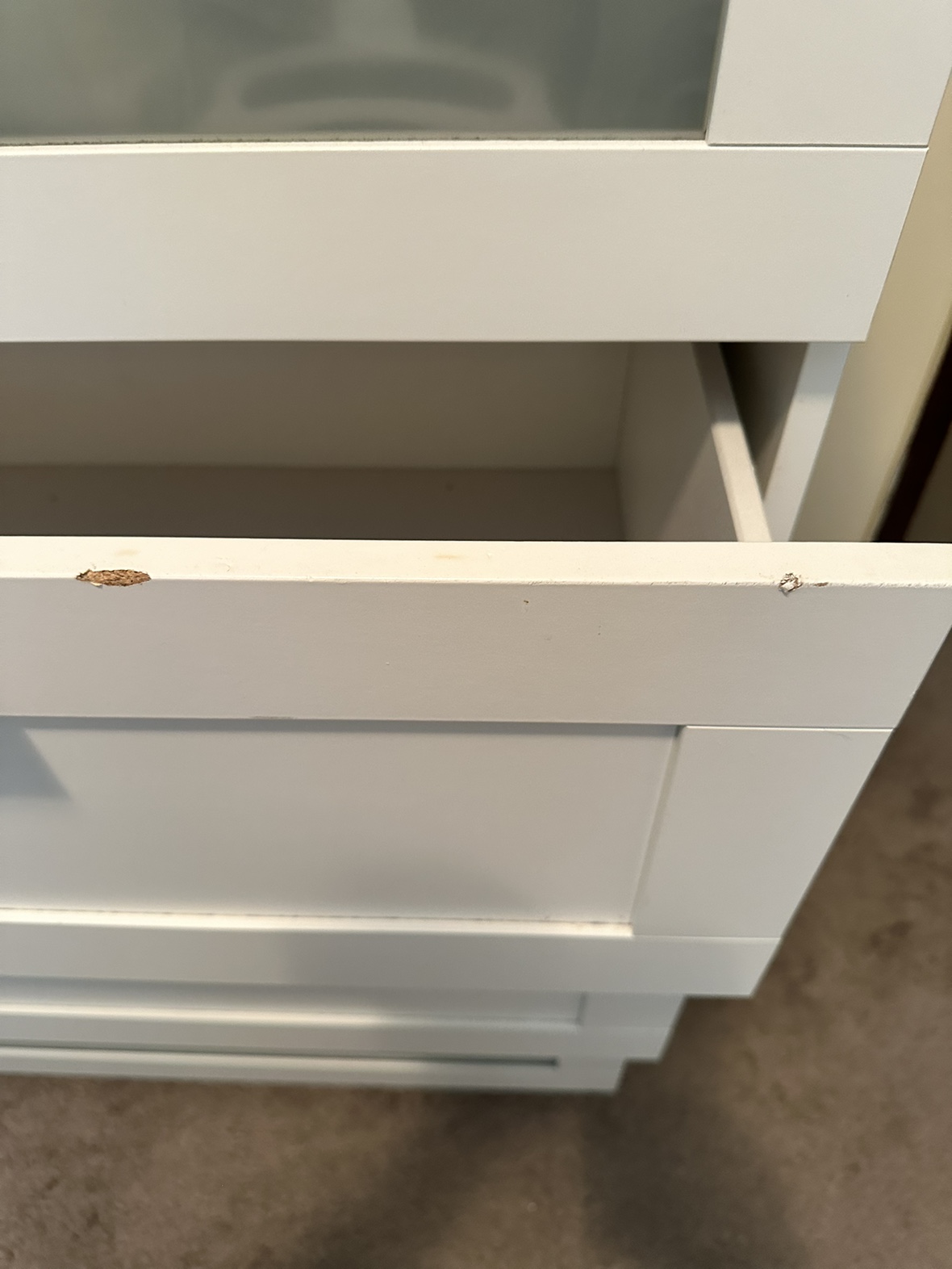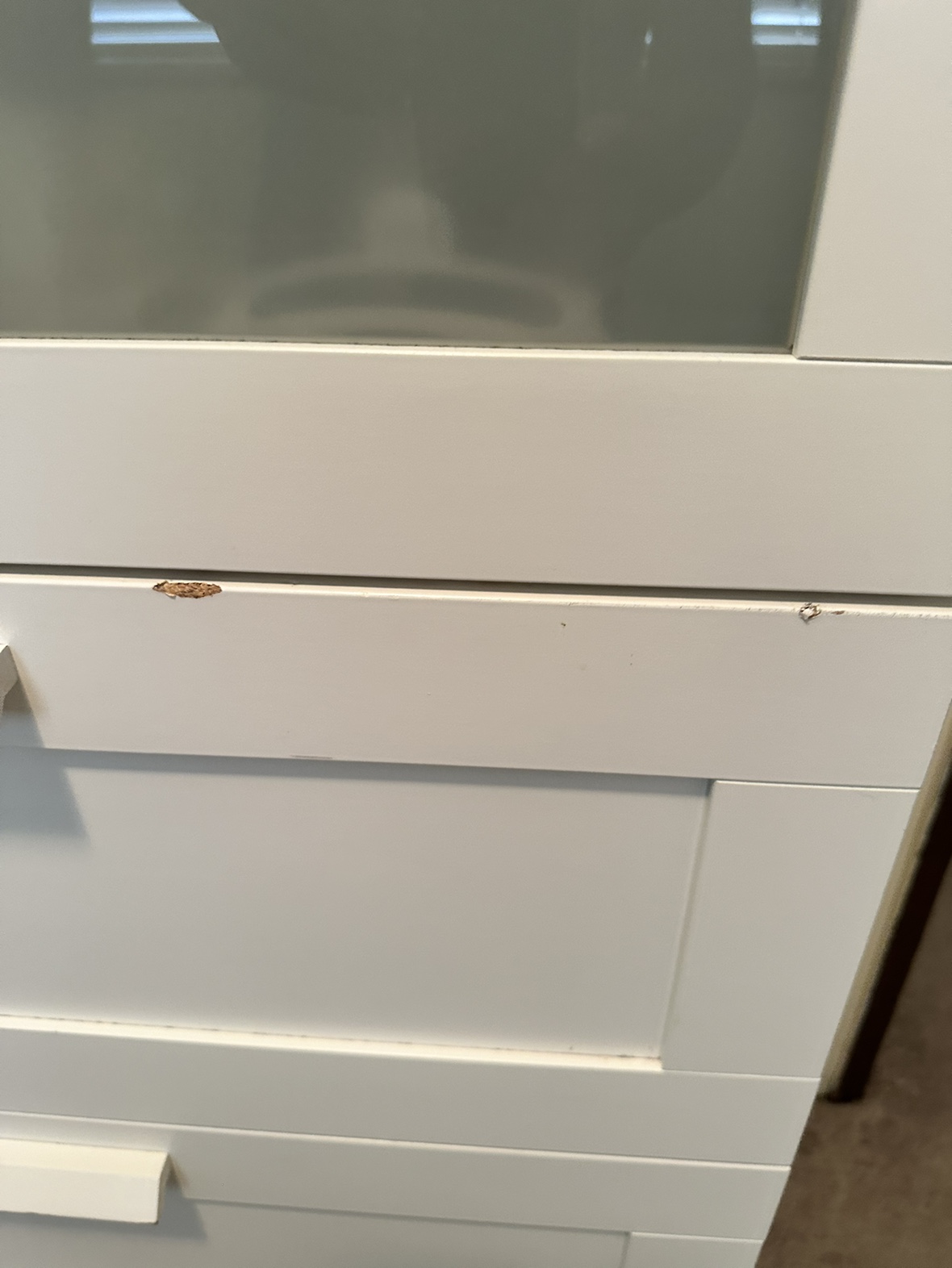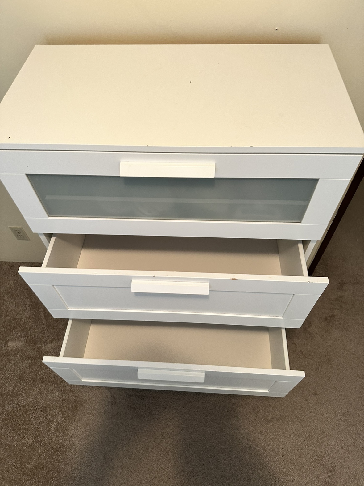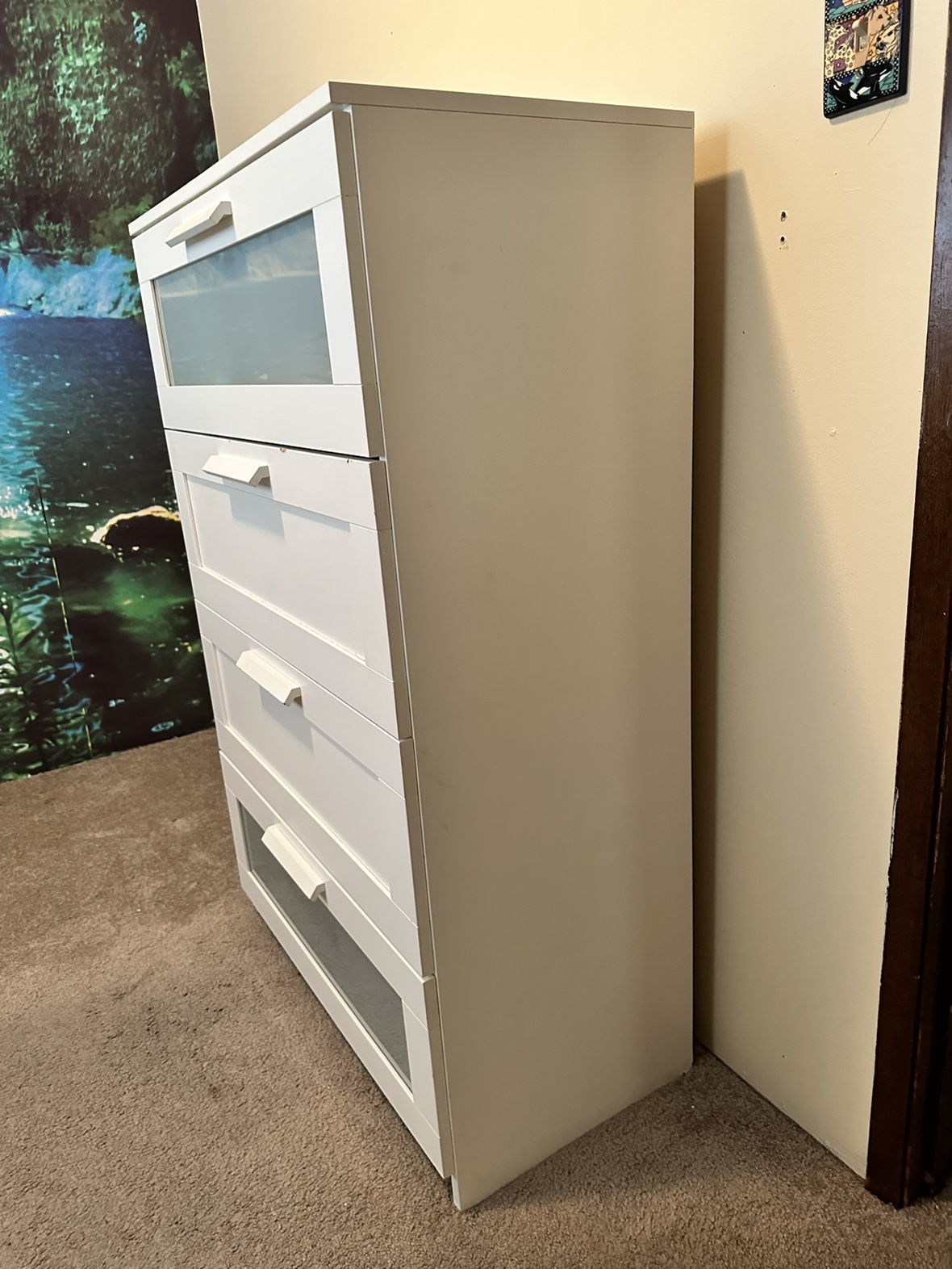 IKEA ( BRIMNES ) 4-drawer chest, white, 78x124 cm (30 3/4x48 7/8 ") 2 Frosted glass top drawer. (Ikea sells it with one glass drawer, we had 2 and this one is from the other one) CLEAN (no bad smell, no stickers, no markings) Good condition (may need some easy adjustments) Some minor dents and scratches that you do some easy touchups to it (see pictures) Paid $300 Selling for $45