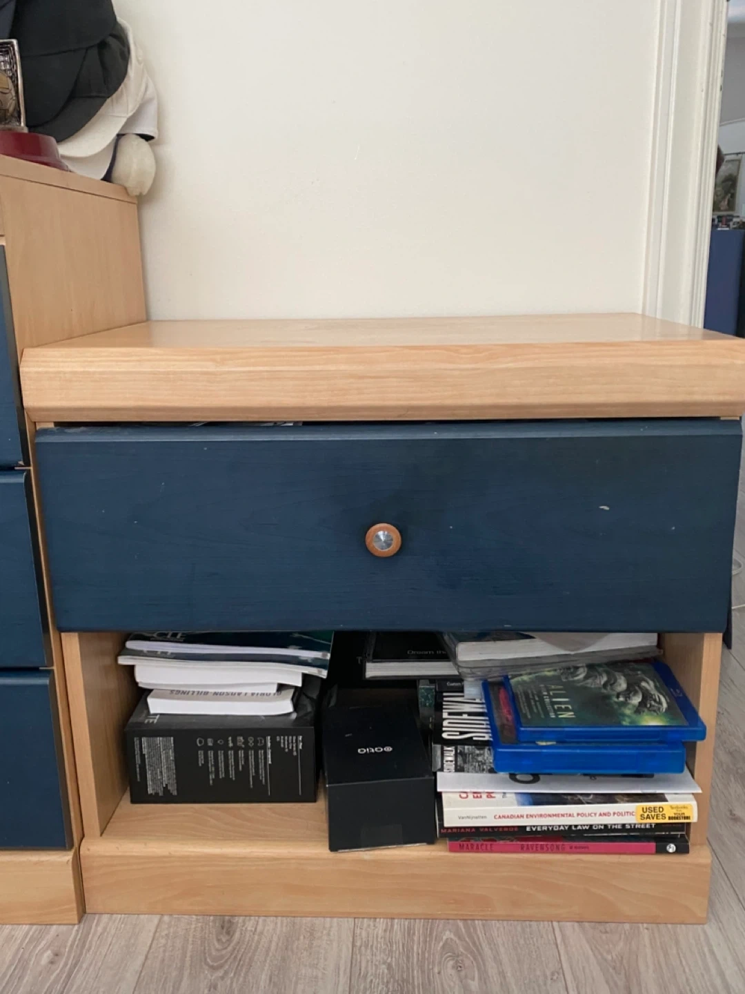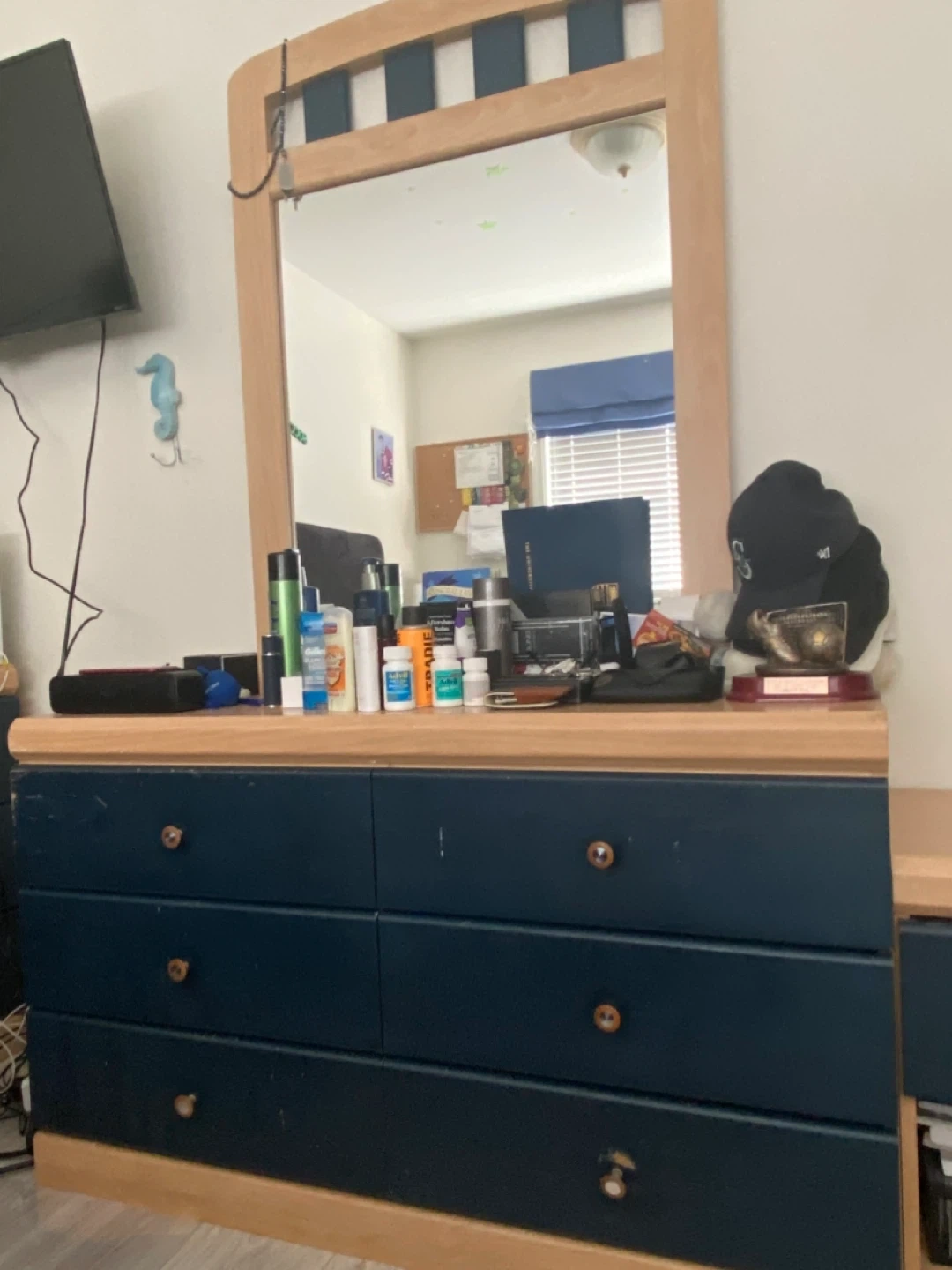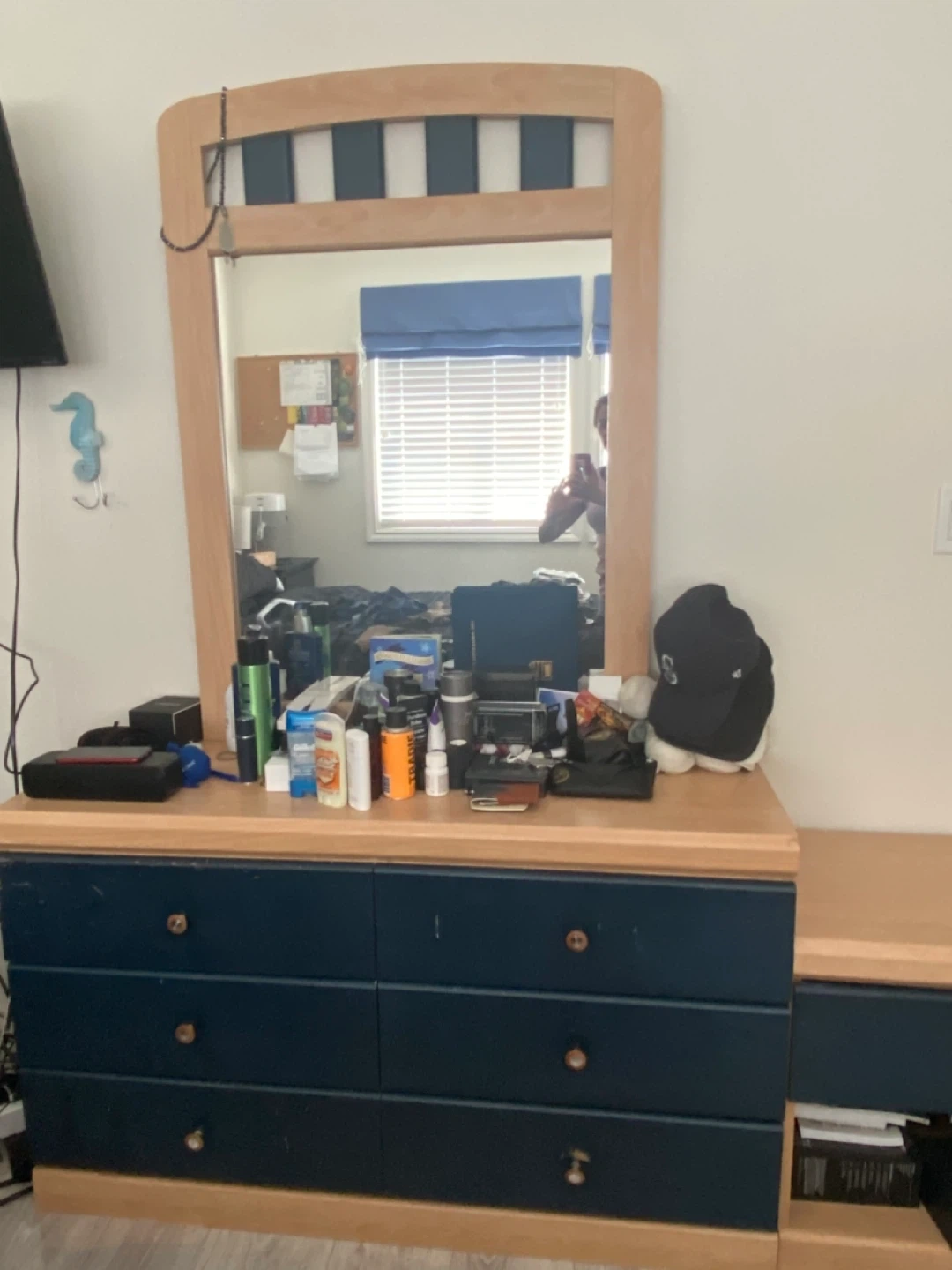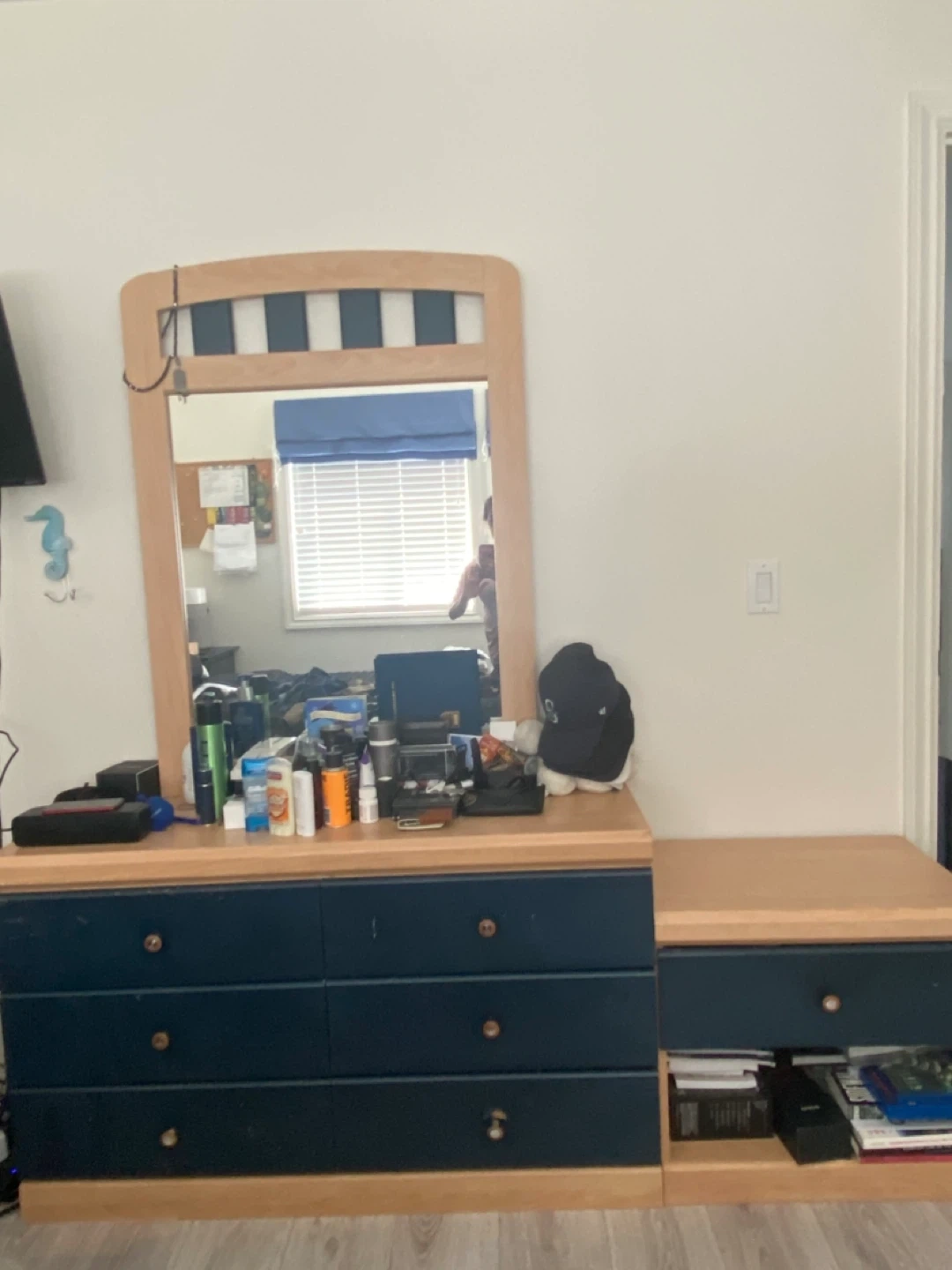 10Selling a dresser with a mirror and a matching desk and nightstand. It's a sturdy set with a classic design. The dresser has six drawers, and the nightstand has one drawer with an open shelf below. The desk has a keyboard tray with drawers on the side. Perfect for adding storage to your bedroom or students !