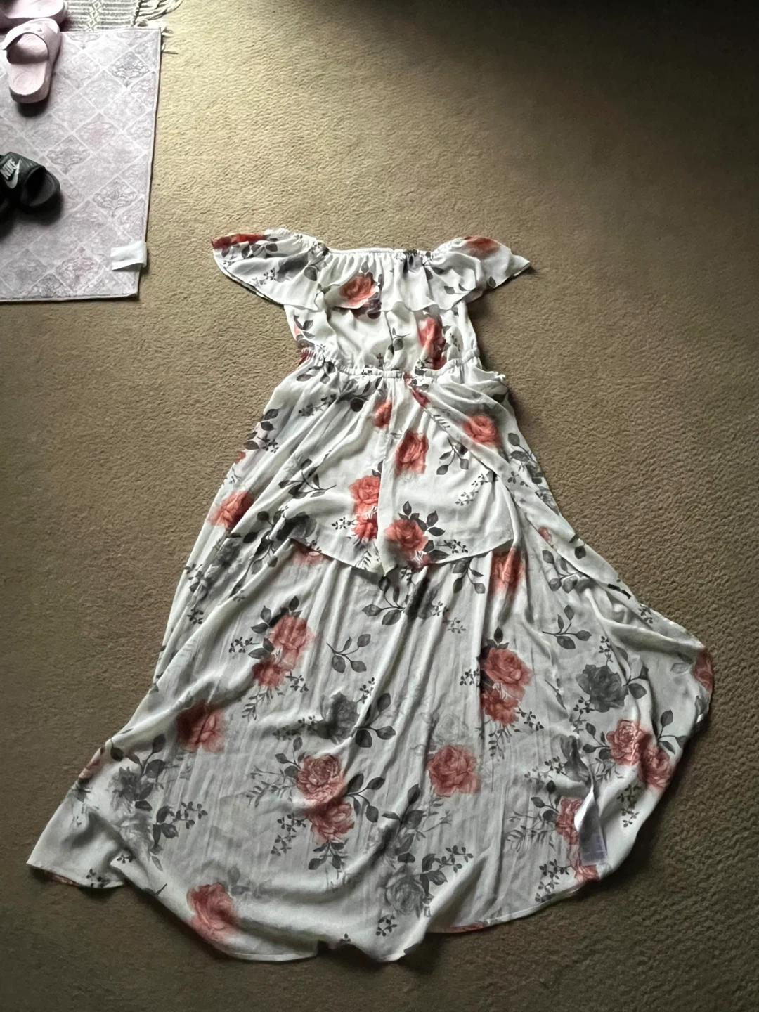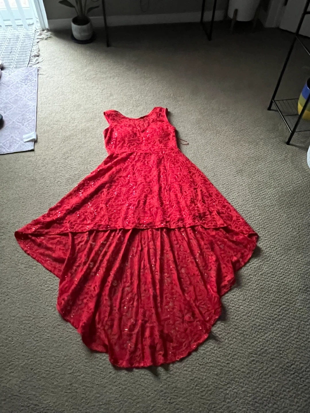 15Selling three dresses in great condition! There's a black off-the-shoulder dress, a white dress with a floral pattern with shorts built in and a train behind, and a red dress with lace detailing with sequences and a waterfall design. Perfect for any occasion