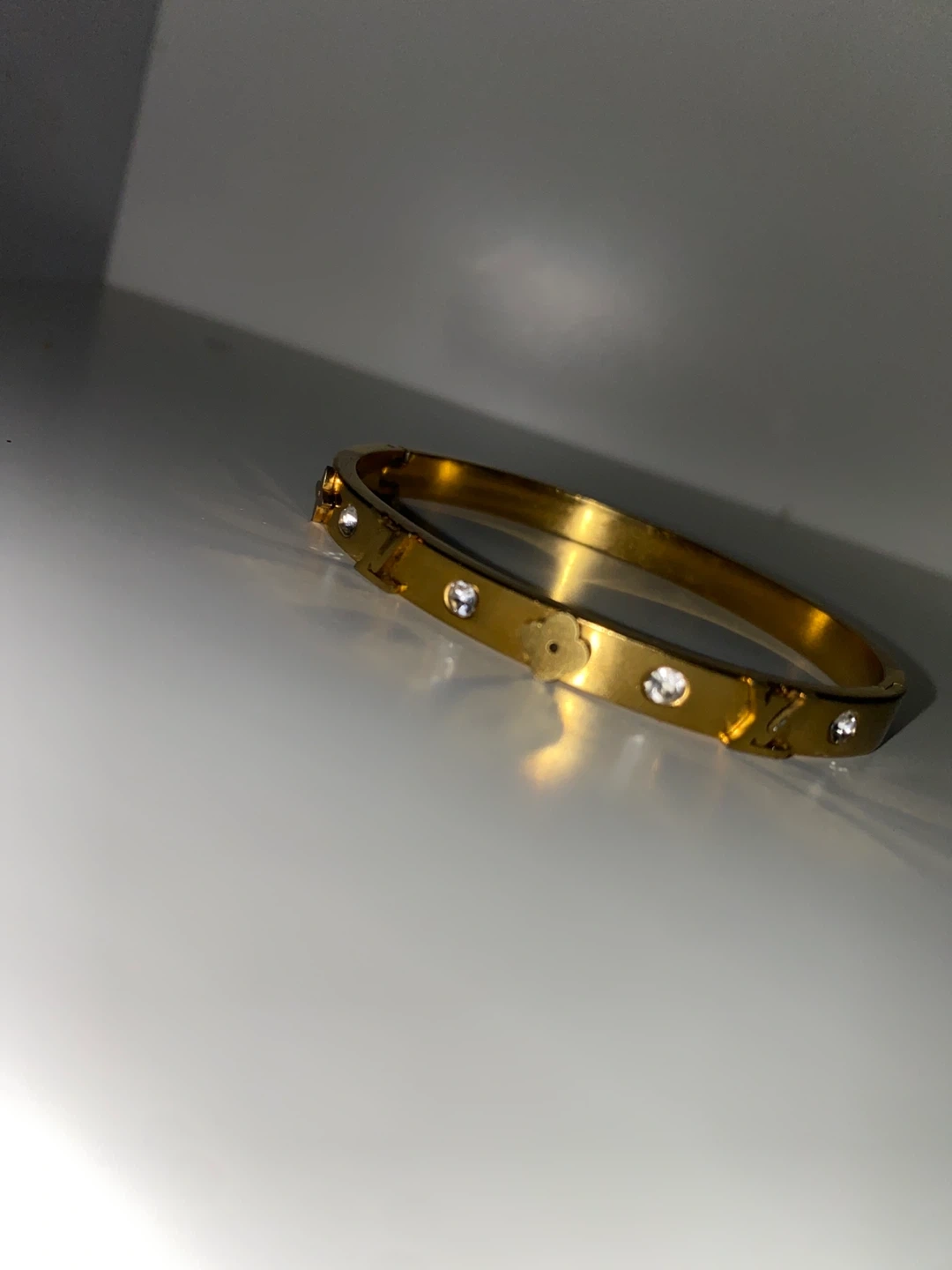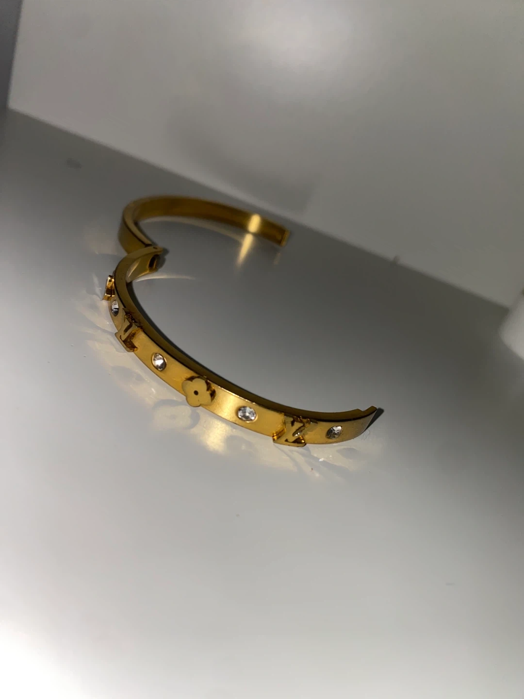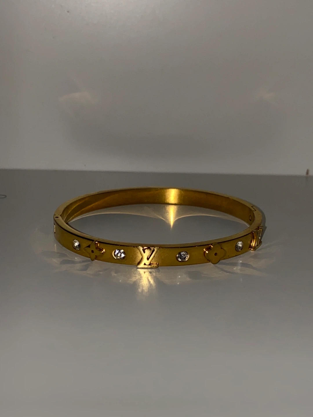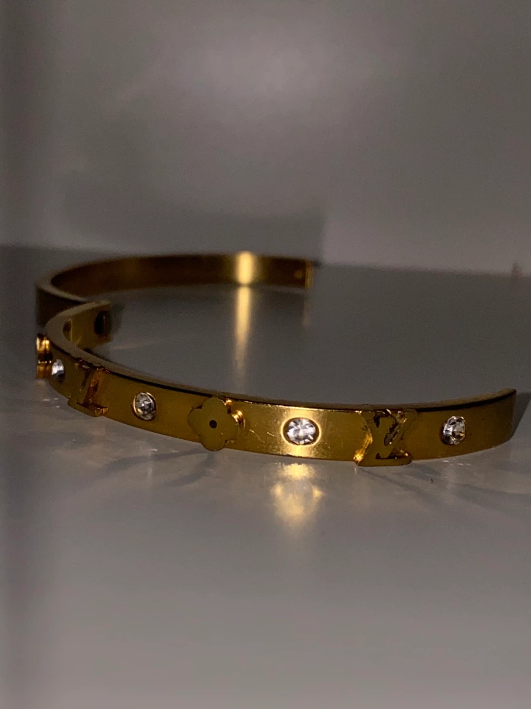 Selling a gold bangle bracelet! It features decorative LV/ Louis vuitton charms and diamond sparkling accents all around the front band. A stylish addition to any outfit!