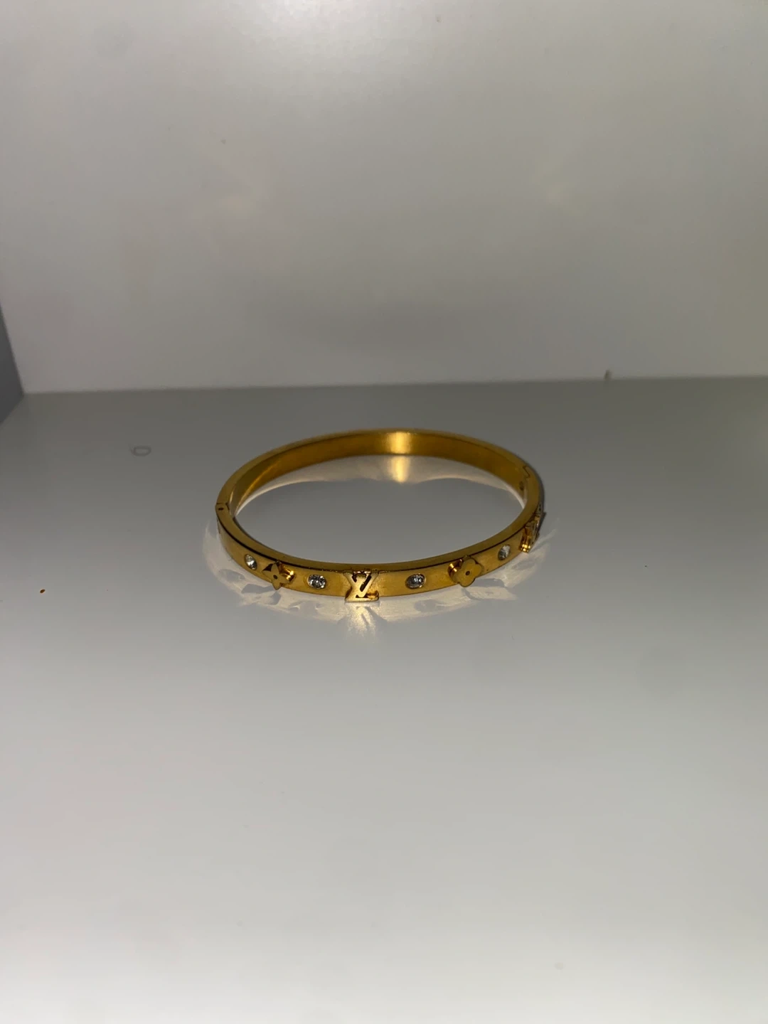 Selling a gold bangle bracelet! It features decorative LV/ Louis vuitton charms and diamond sparkling accents all around the front band. A stylish addition to any outfit!