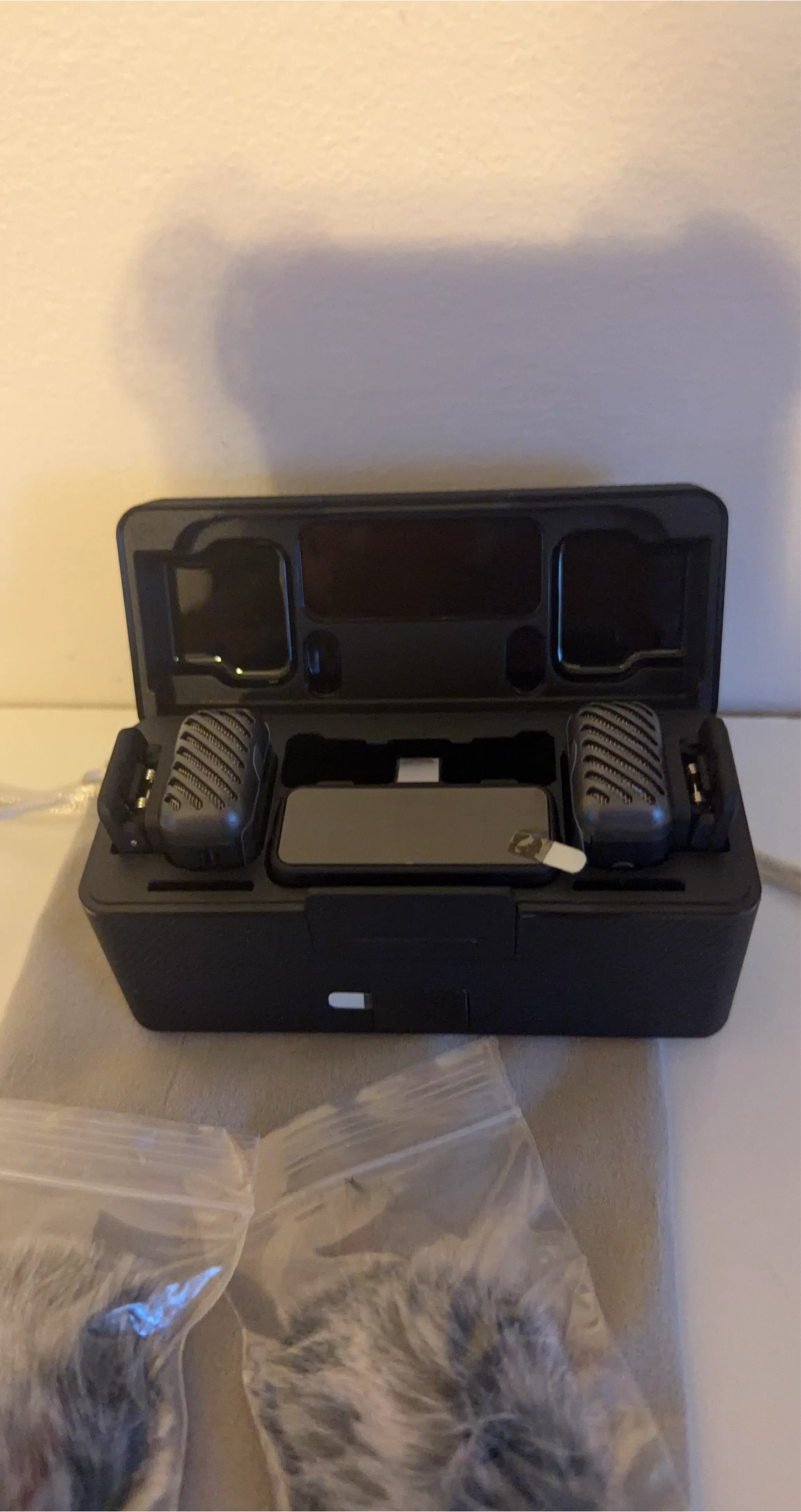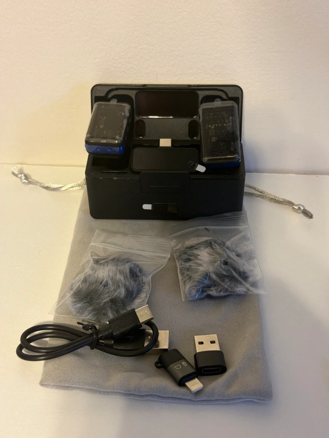 This set includes two wireless lavalier microphones and a charging case. It comes with furry windscreens for each mic and multiple charging cables including USB-C and Lightning adapters. Great for capturing clear audio on the go!