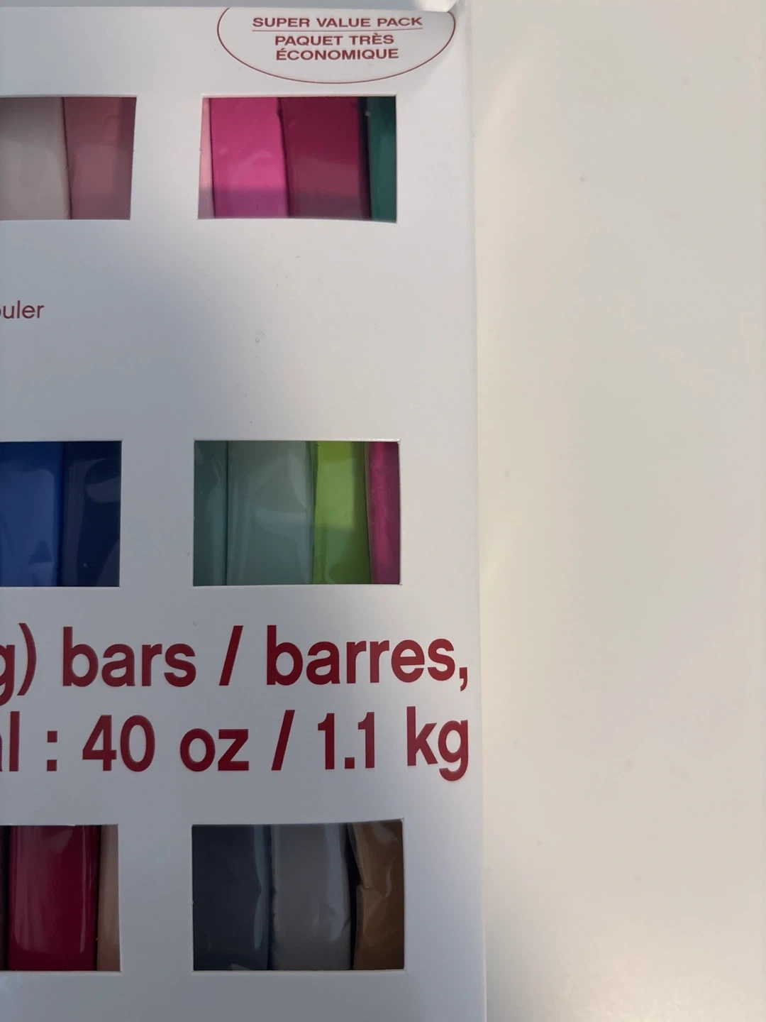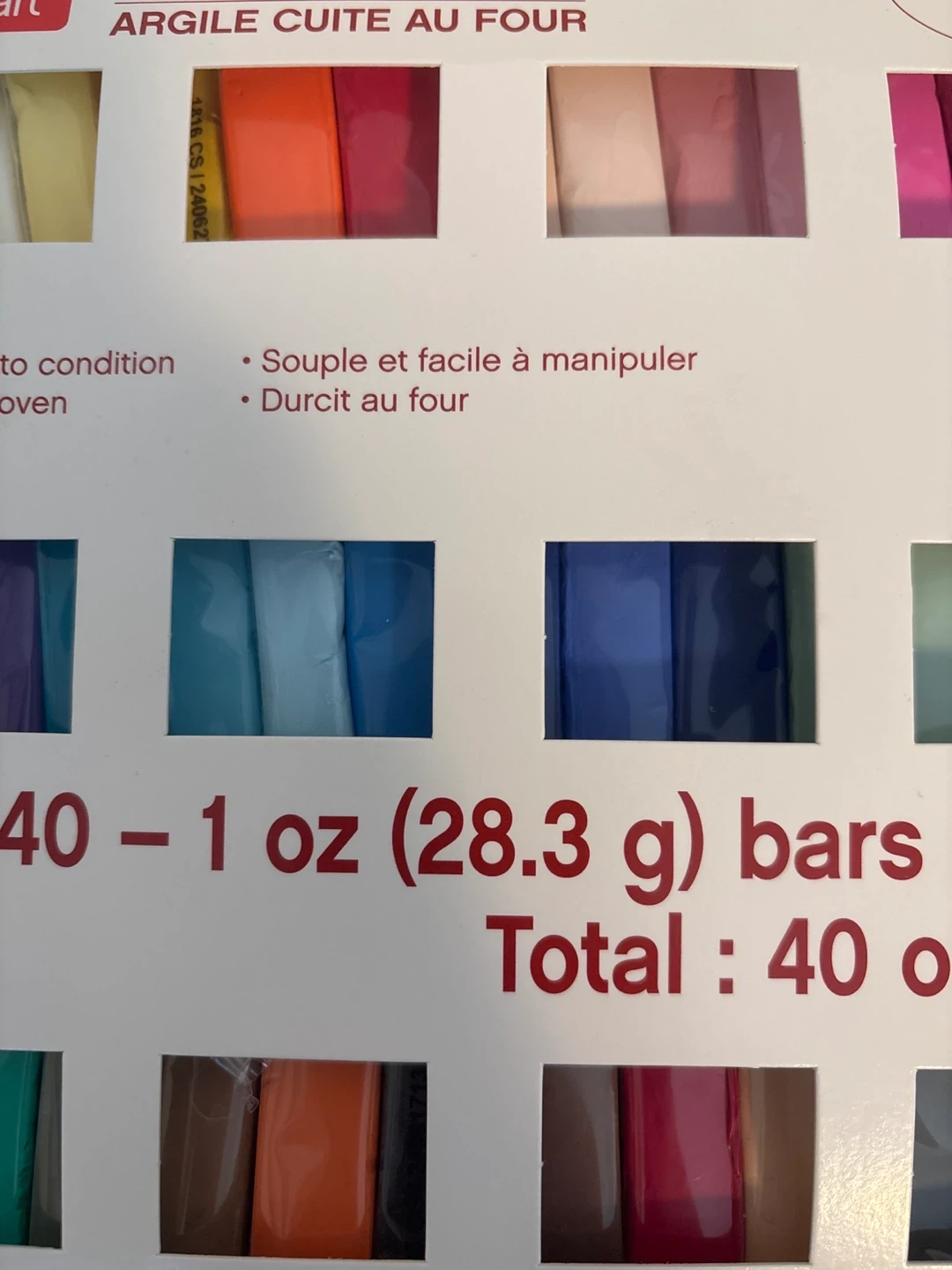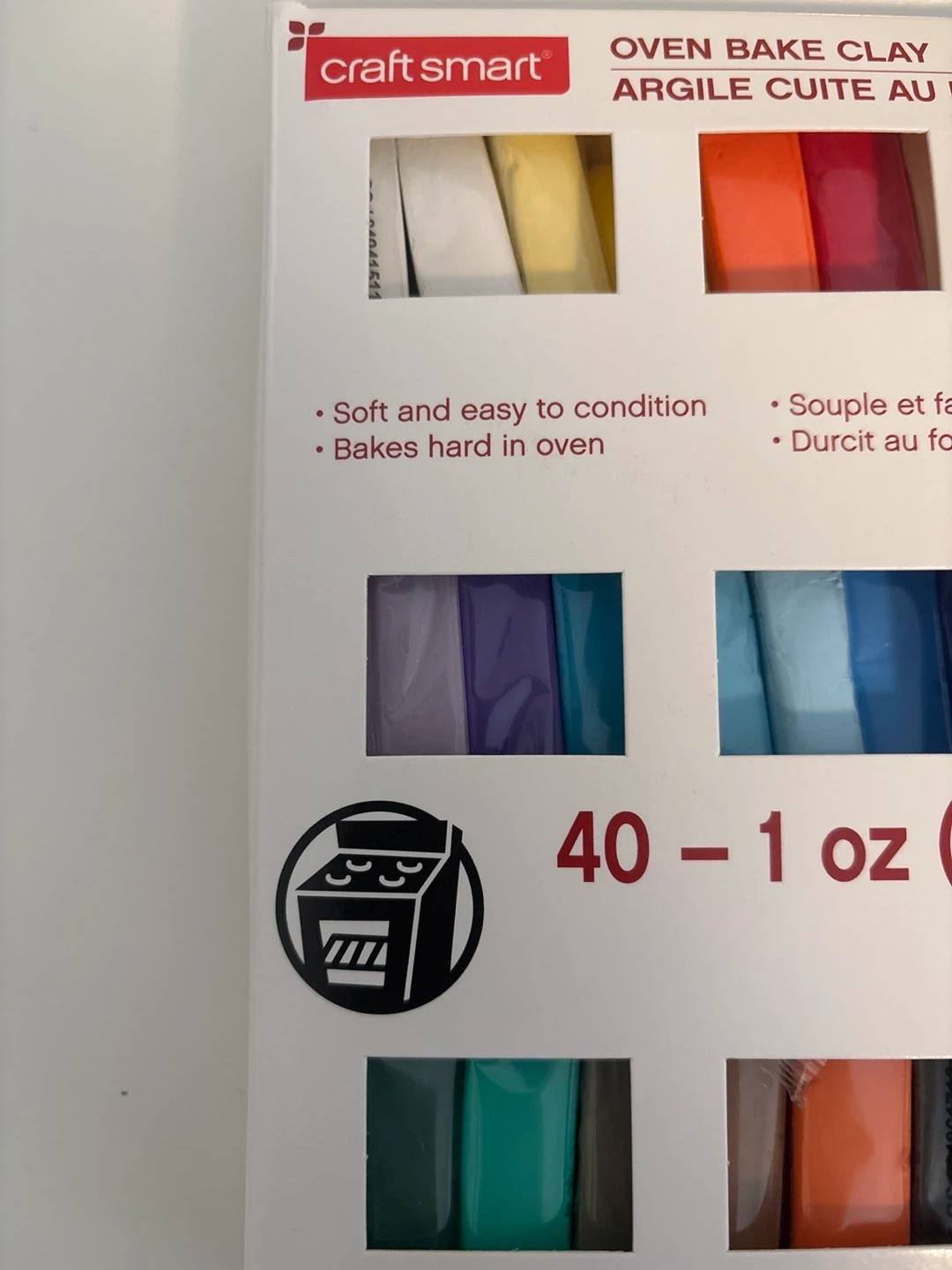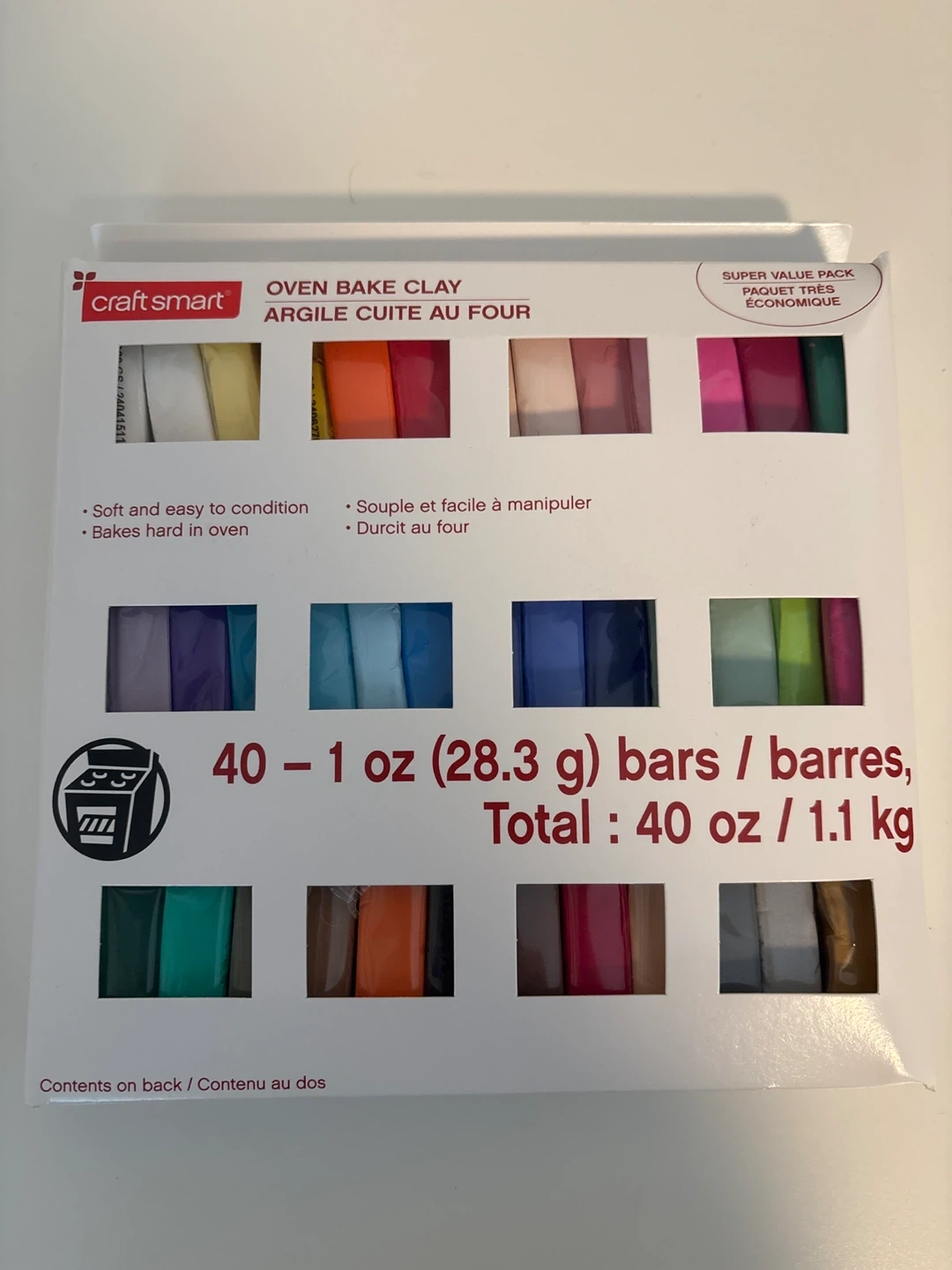 This is a Craft Smart oven bake clay set. It includes 40 bars, each weighing 1 oz (28.3 g), for a total of 40 oz (1.1 kg). The clay is soft and easy to condition and bakes hard. It's perfect for sculpting and crafting projects!