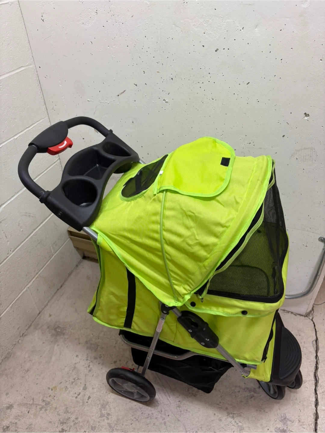 This is a lime green pet stroller for small animals. It has a breathable mesh window and a storage basket underneath. Convenient cup holders are on the handle.