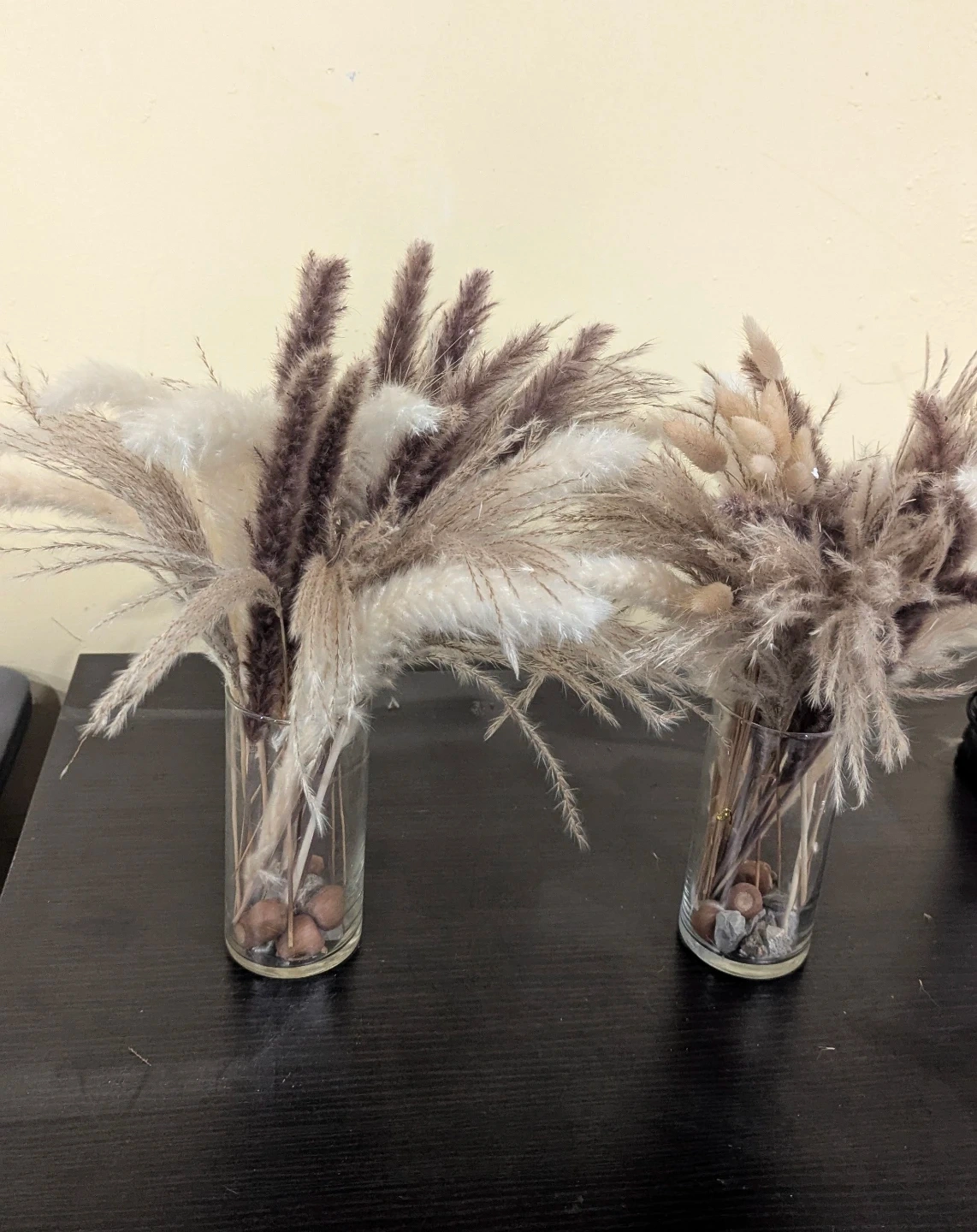 20Two lovely dried pampas grass arrangements in glass vases. They add a natural and elegant touch to any room!