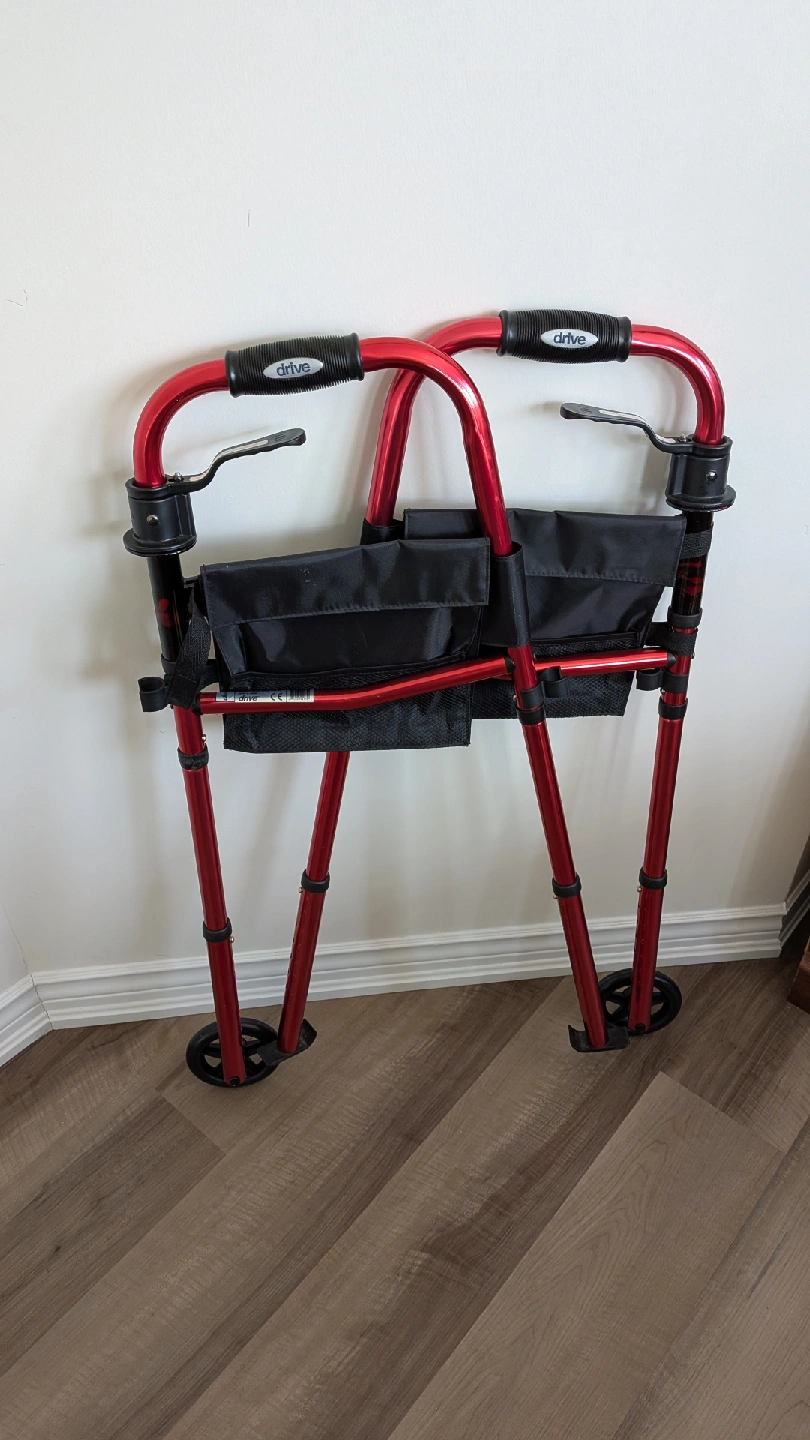 Selling a Drive walker in red! It features a seat for resting and folds up for easy storage. Great for anyone needing a bit of extra support while getting around. Item was used twice. Great condition.