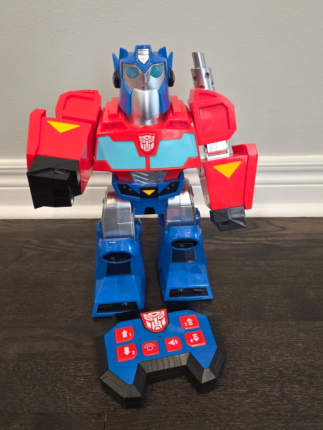 This is a Transformers Optimus Prime remote control robot toy. It's red, blue, and silver with a classic Autobot symbol. The toy comes with a blue remote control that has various buttons for movement and sound effects. Suitable for kids who love Transformers!