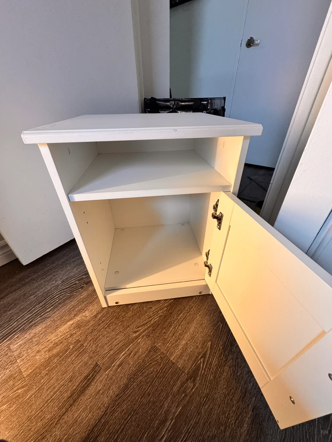 White nightstand with a single door and an open shelf. Includes one drawer for storage. It's made of particleboard with a foil finish. Dimensions are 42x40 cm.