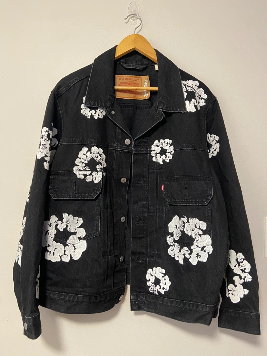 Levi Strauss & Co. and Denim Tears have collaborated on this cool jacket! It's a size Large and features a unique floral design on a black denim base. Perfect for adding a bit of style to your wardrobe