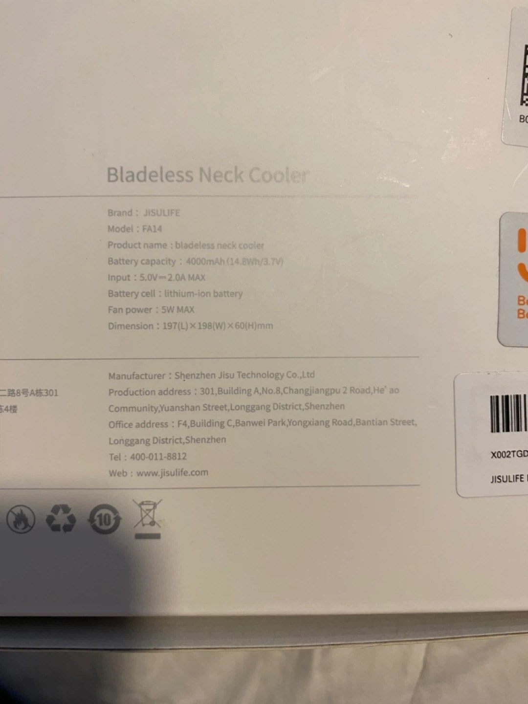 This JISULIFE bladeless neck cooler is model FA14. It has a 4000mAh battery capacity. The fan power is 5W MAX. The dimensions are 197mm(L) x 198mm(W) x 60mm(H). Pick Up Morinville or St Albert Clean Smoke Free and Brand New Never Used