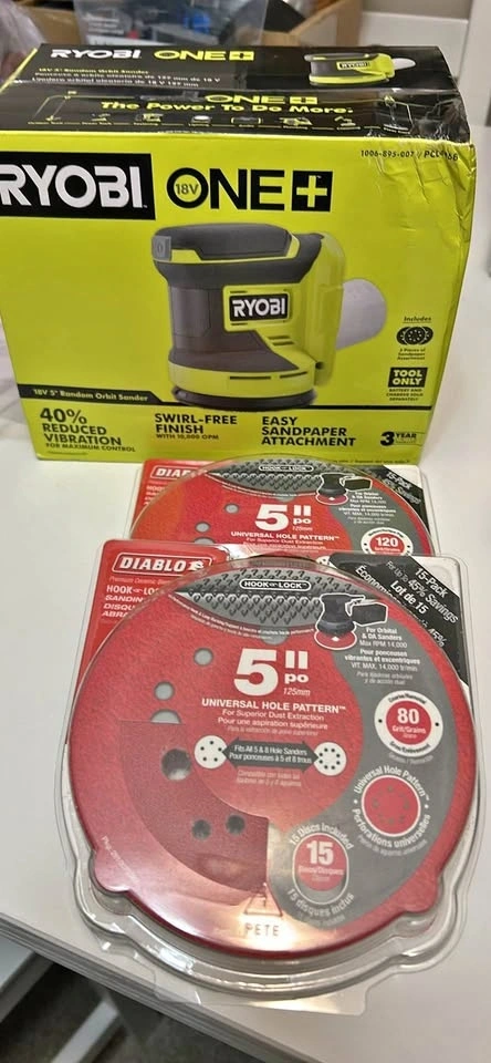 Brand new in box!! Ryobi 18v 5” Random Orbit Sander. Included :