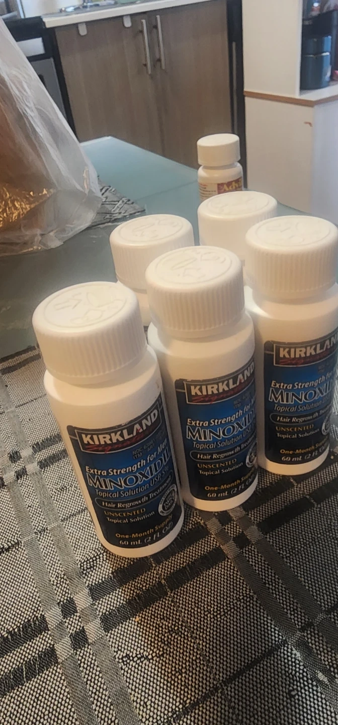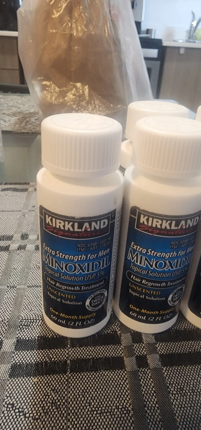 Four bottles of Kirkland Signature Minoxidil Extra Strength for Men Topical Solution 5%. Each bottle is a one-month supply, 60 ml (2 fl oz).