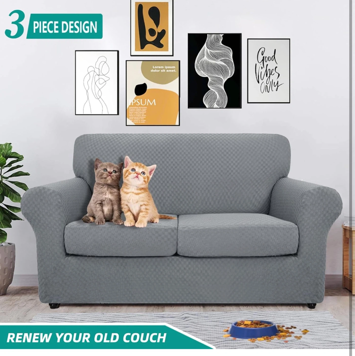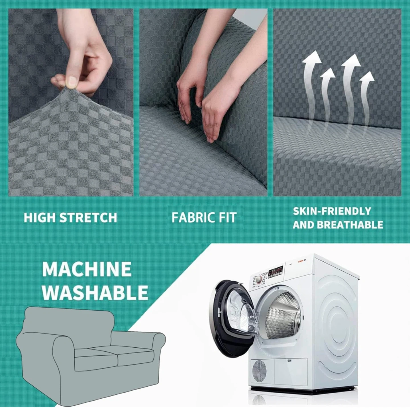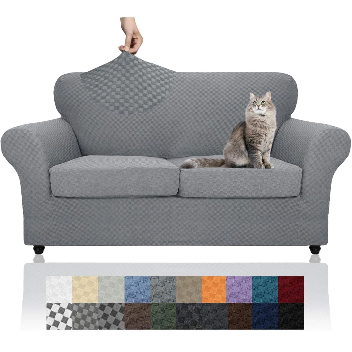 This is a grey loveseat sofa cover from Yemyhom. It's a 3-piece design with a removeable cushion cover for full protection. The fabric is high stretch, skin-friendly, and breathable. It's also machine washable. This cover fits loveseats with separated cushions and an elastic band for an easy fit.