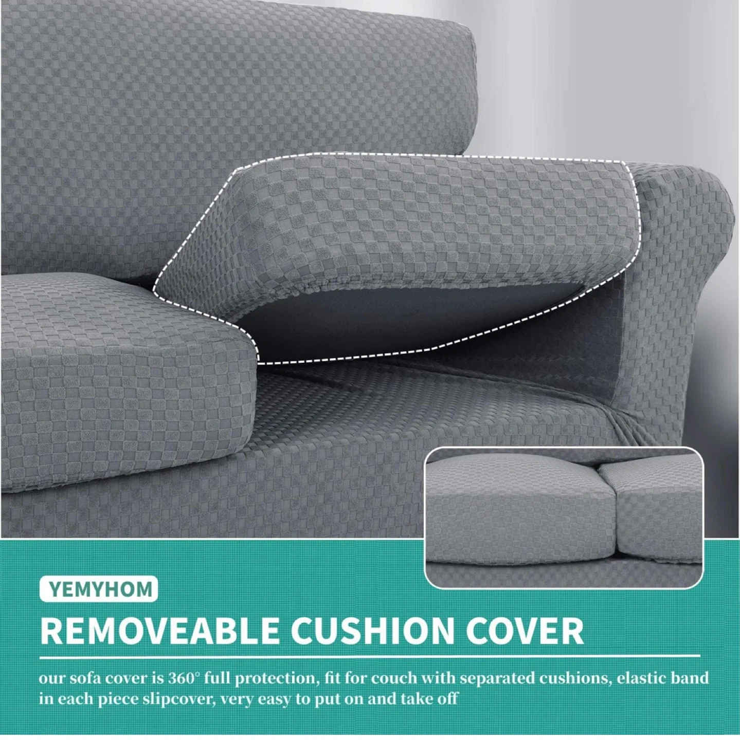 This is a grey loveseat sofa cover from Yemyhom. It's a 3-piece design with a removeable cushion cover for full protection. The fabric is high stretch, skin-friendly, and breathable. It's also machine washable. This cover fits loveseats with separated cushions and an elastic band for an easy fit.