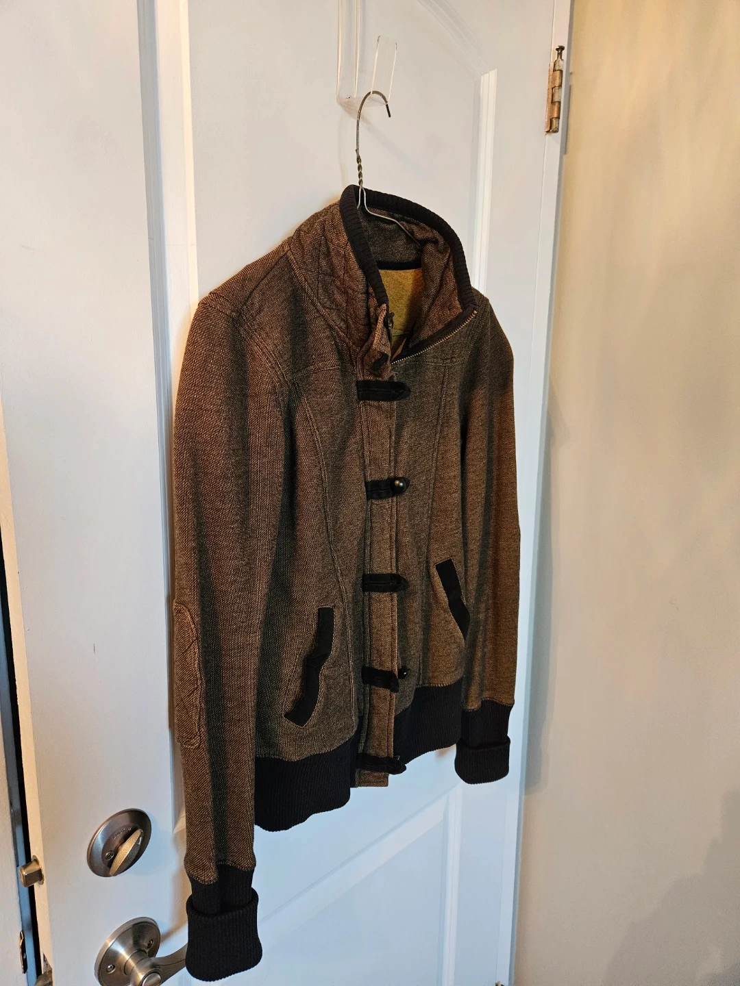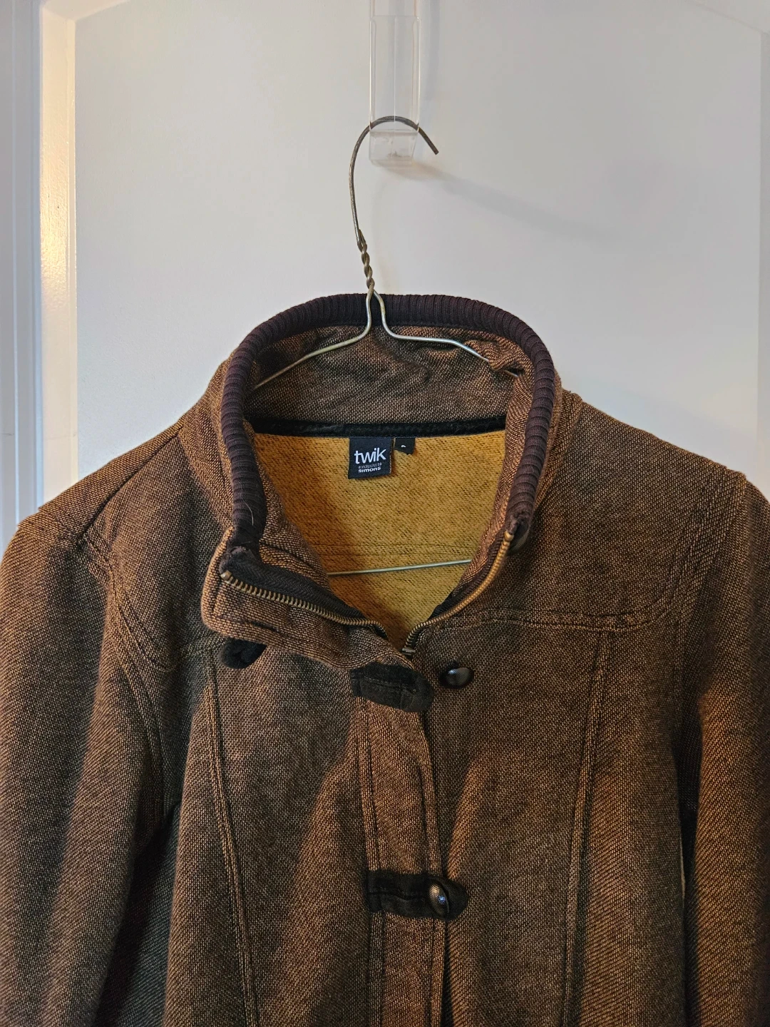 This Twik jacket is a size medium and features a brown knit exterior with black accents. It has a toggle and button closure. Great for layering on cooler days!