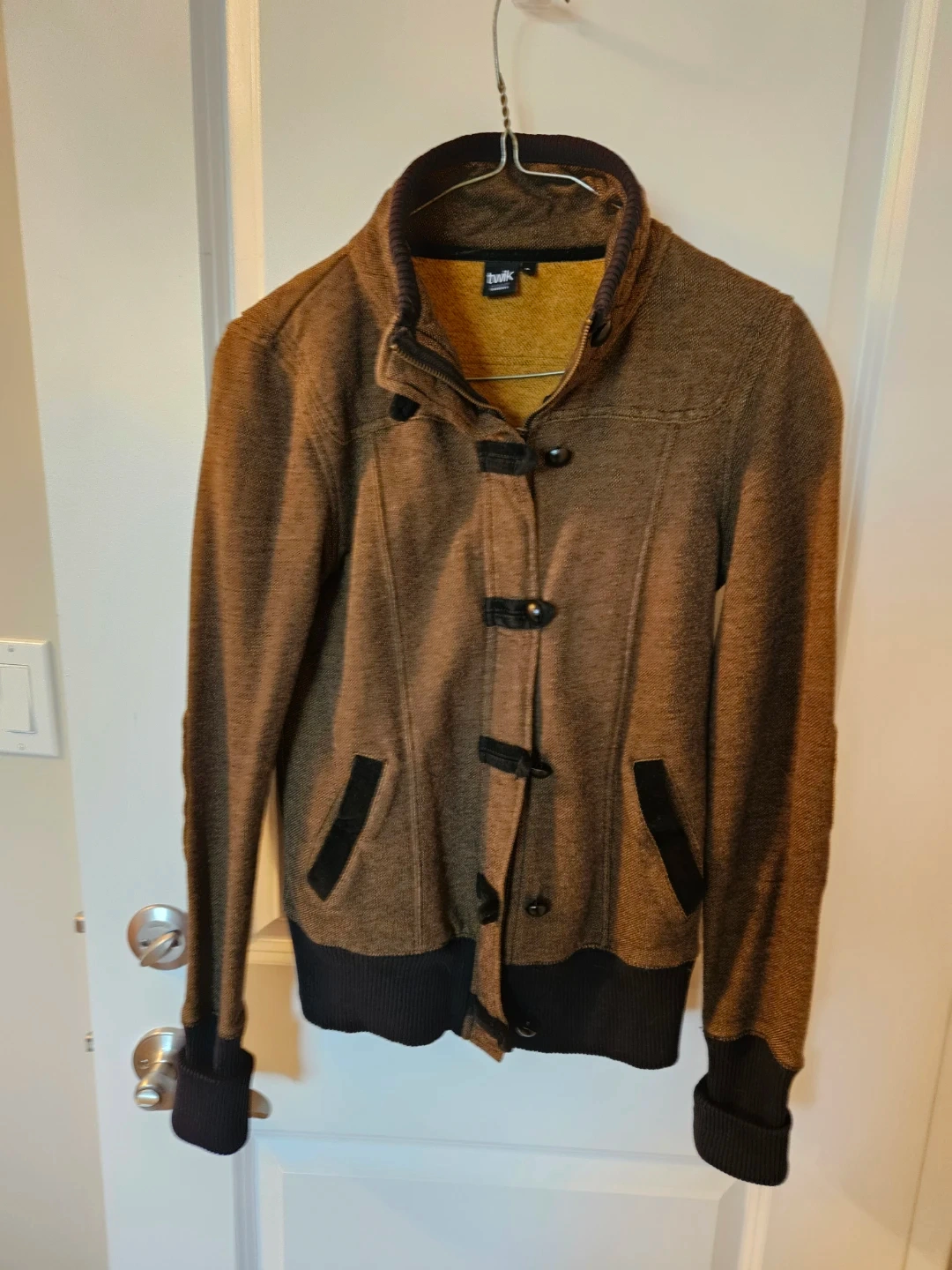 This Twik jacket is a size medium and features a brown knit exterior with black accents. It has a toggle and button closure. Great for layering on cooler days!