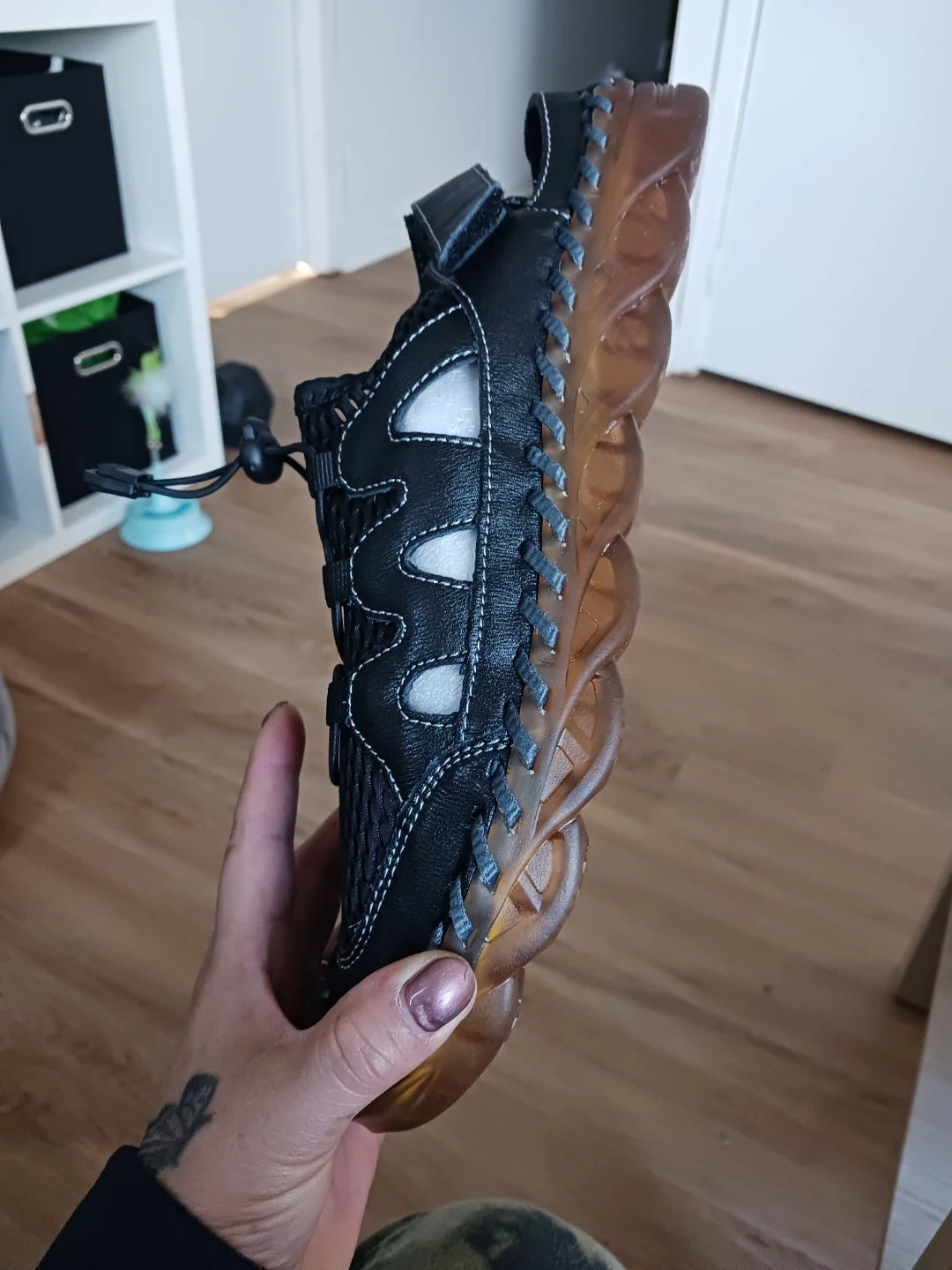 Selling a pair of black leather fisherman sandals. They feature a unique sole design and breathable mesh upper. Great for casual wear!