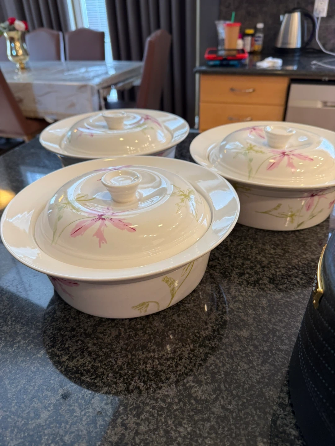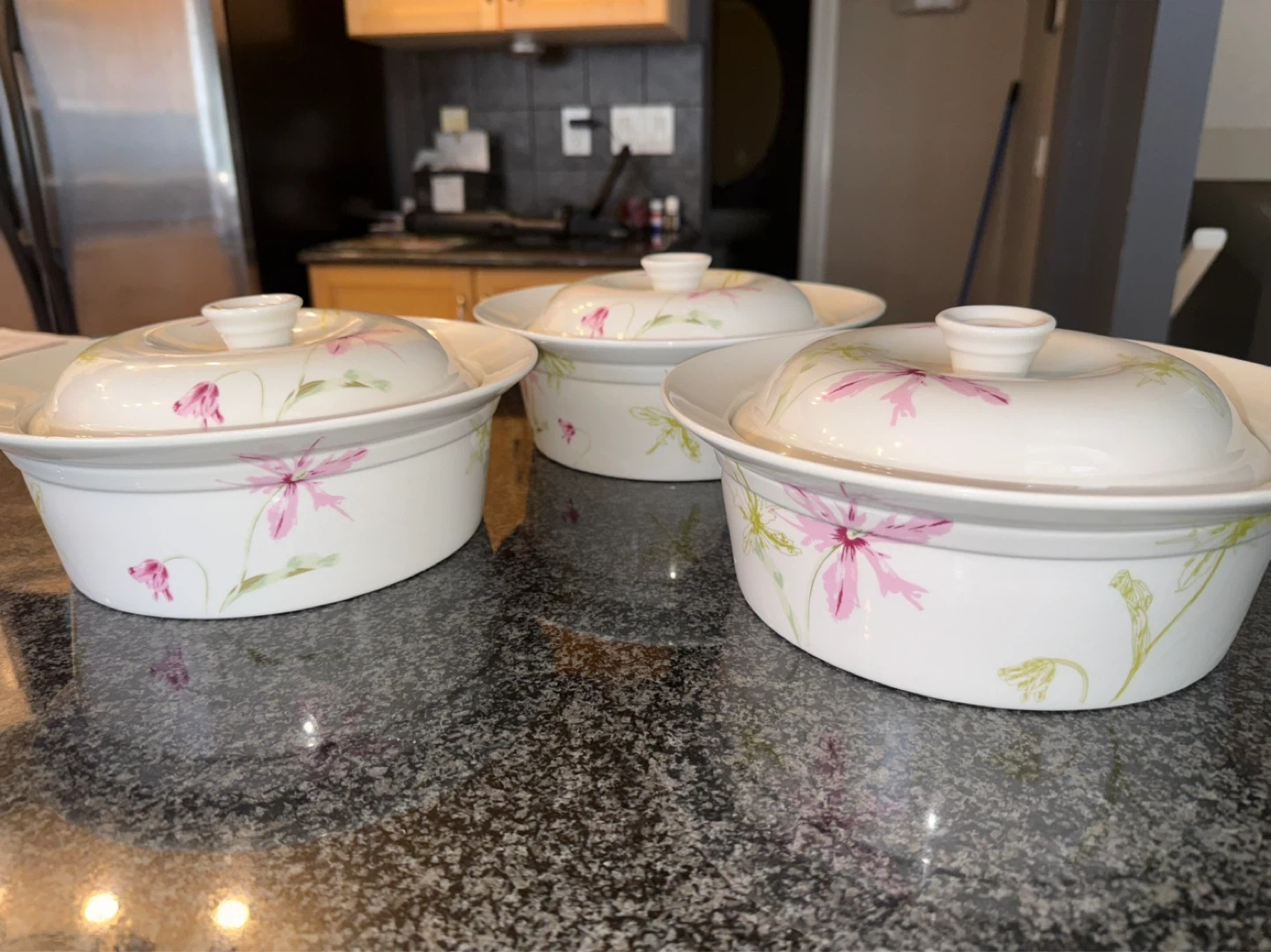 Three white ceramic serving dishes with lids, each featuring a floral and dragonfly design. These dishes are perfect for keeping food warm during meals. They appear to be a set of varying sizes.