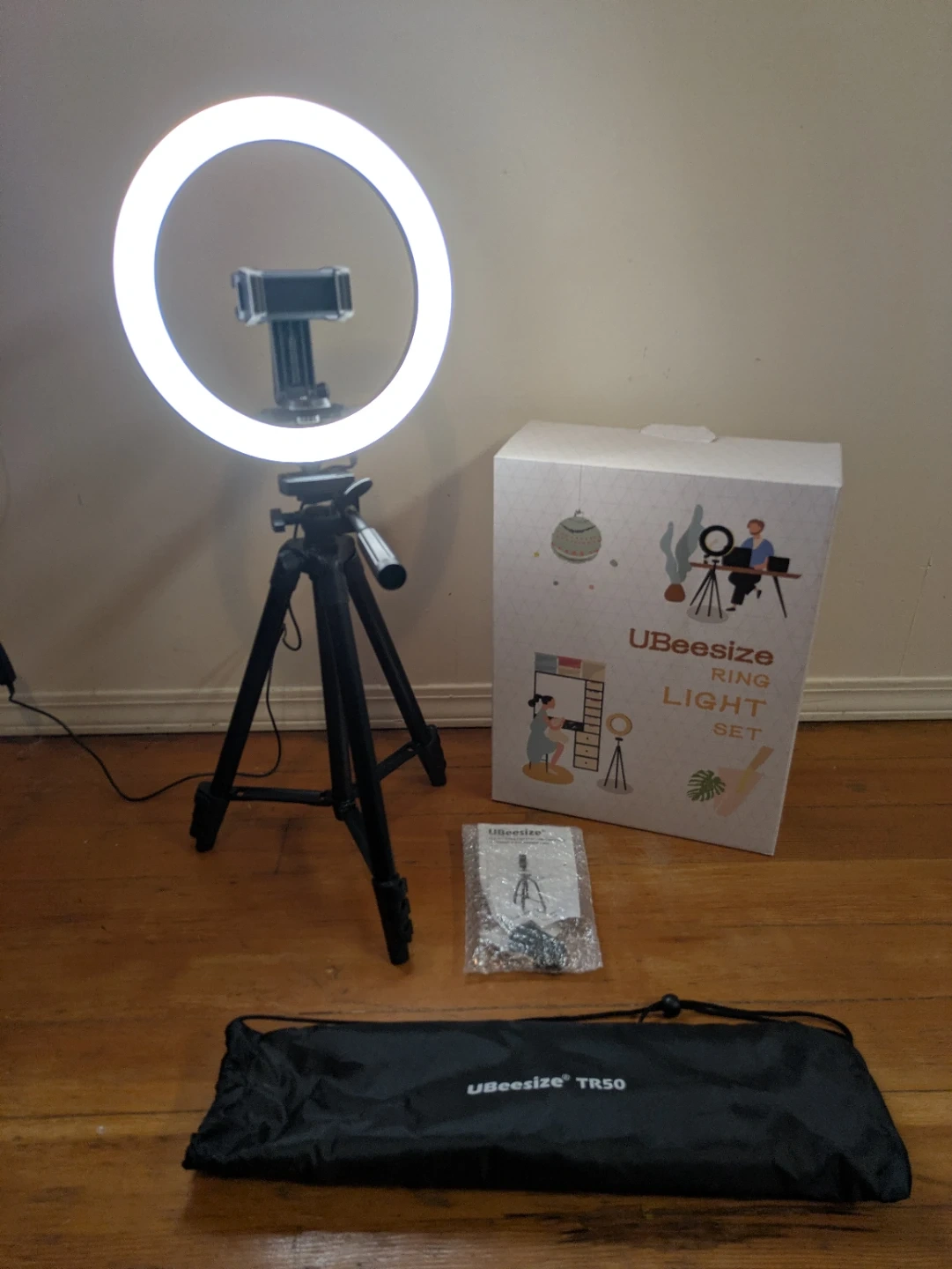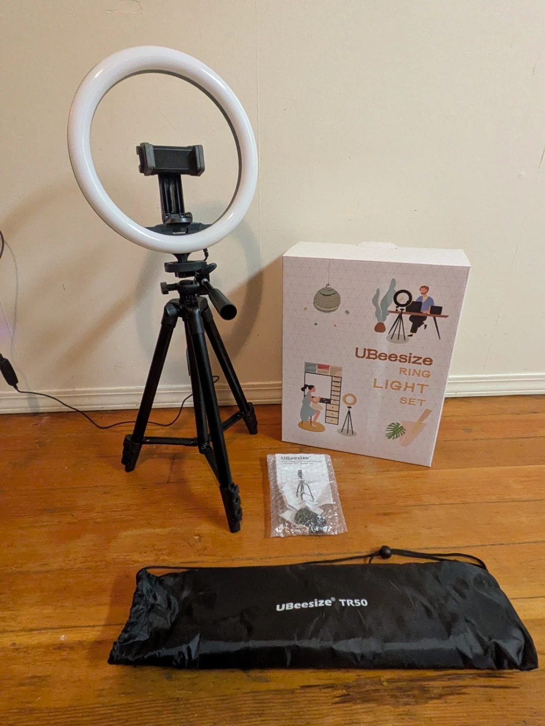 This UBeesize ring light set comes with a tripod and a carrying bag. It's perfect for content creators and anyone looking to improve their lighting. It includes the 10" ring light, adjustable tripod, and all necessary accessories. Light has remote control to adjust preference of 3 different tones.