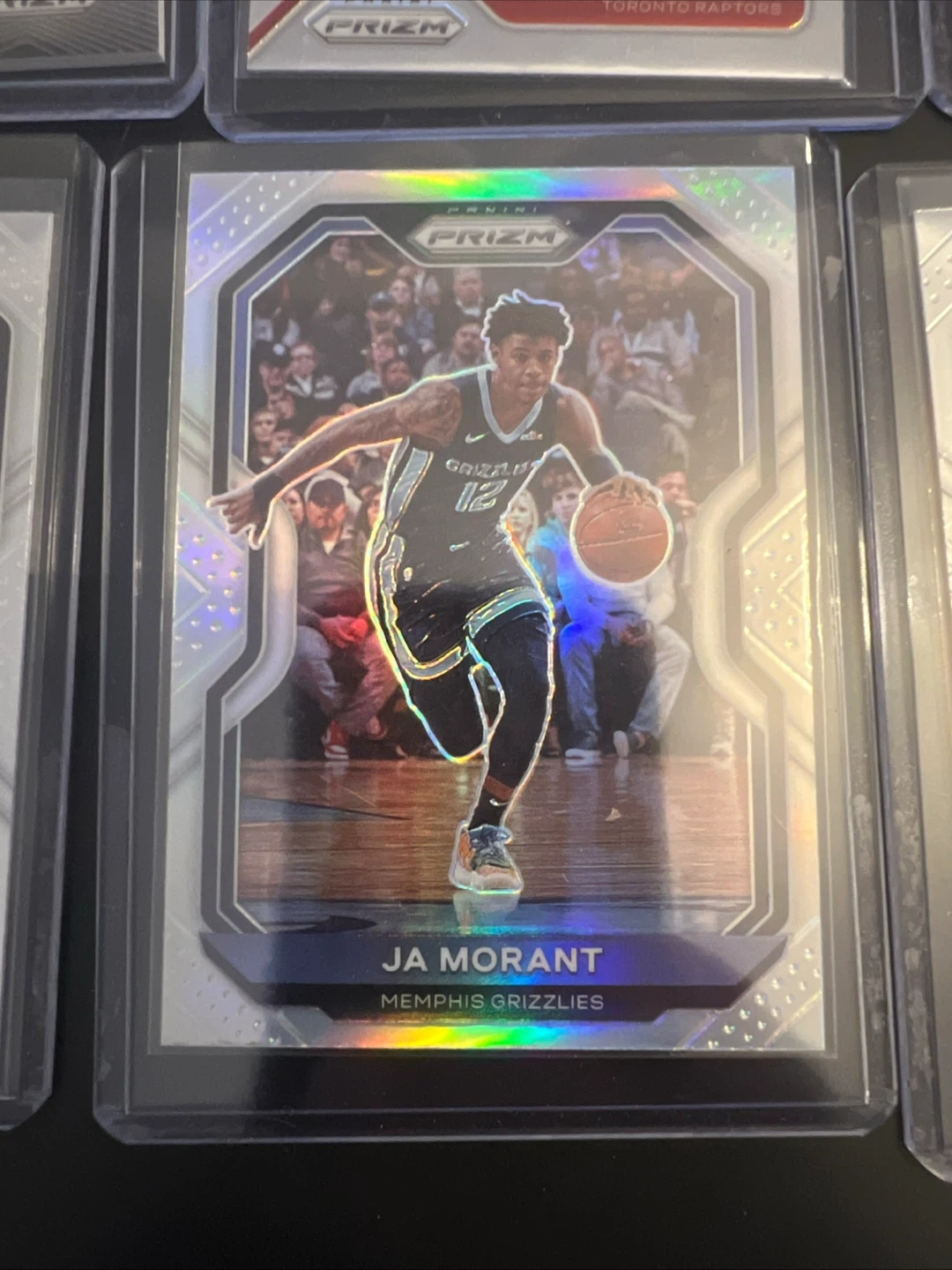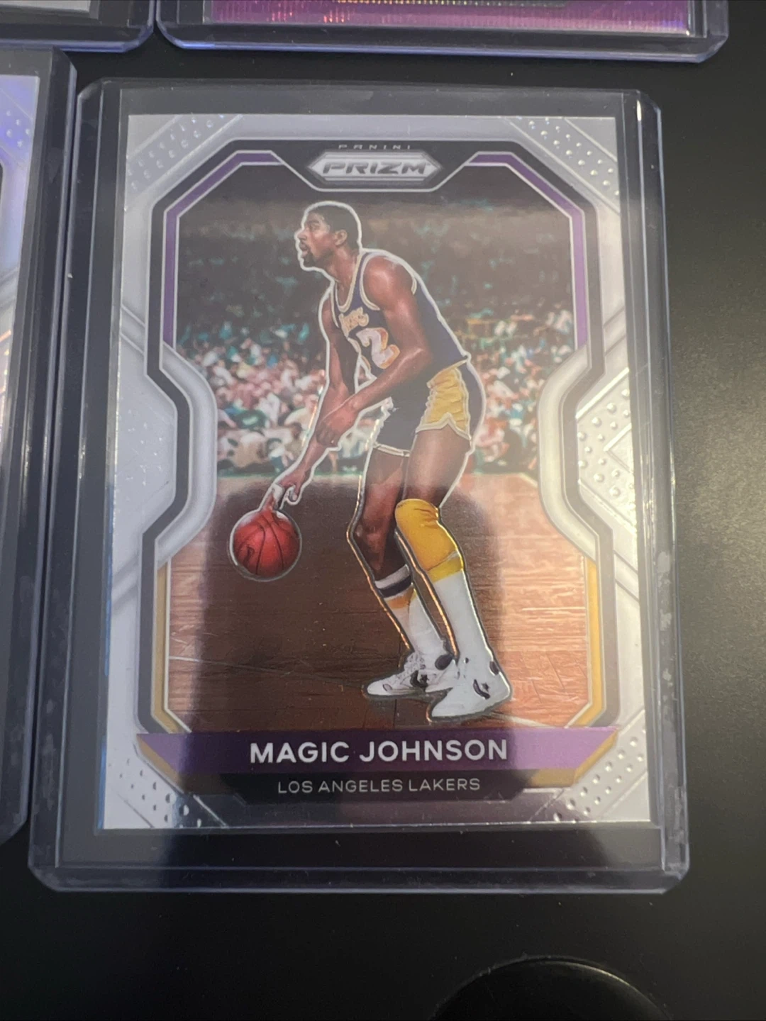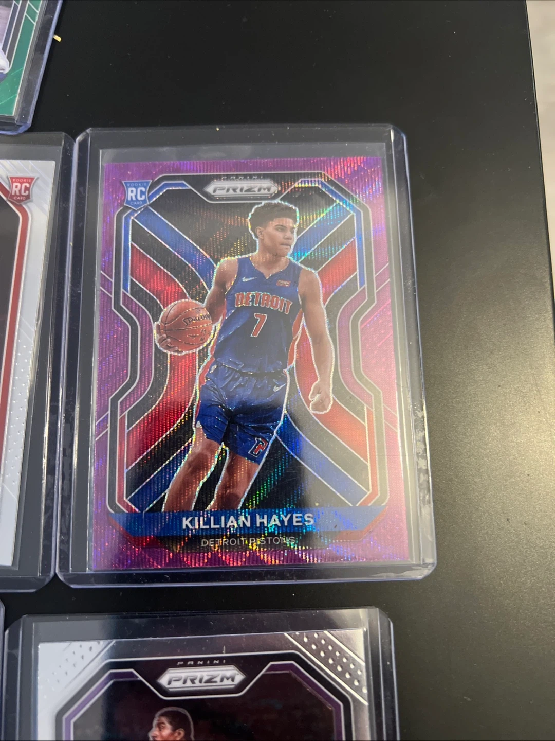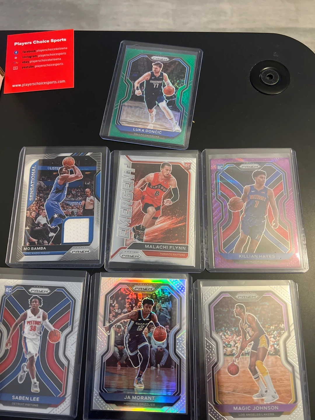 Collection of Panini Prizm NBA trading cards featuring various players like Killian Hayes, Saben Lee, Ja Morant, Mo Bamba, Malachi Flynn, Luka Doncic, and Magic Johnson. Cards are in protective sleeves.