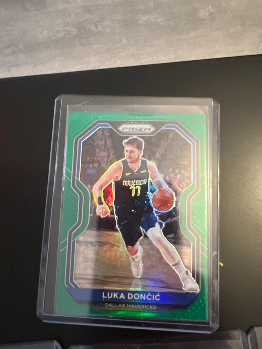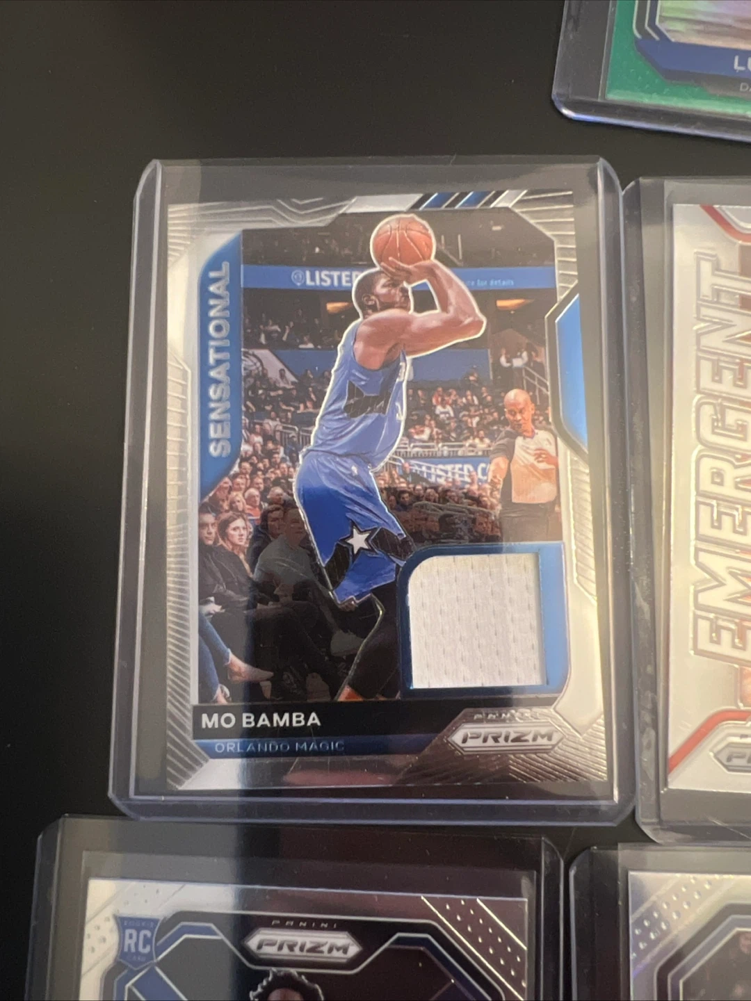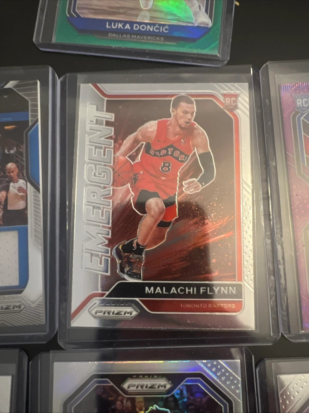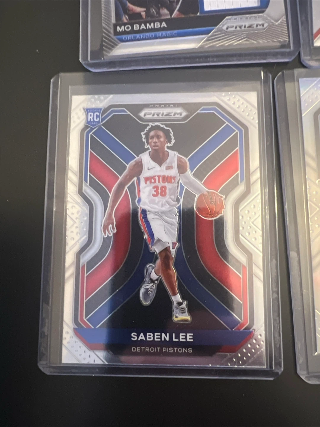Collection of Panini Prizm NBA trading cards featuring various players like Killian Hayes, Saben Lee, Ja Morant, Mo Bamba, Malachi Flynn, Luka Doncic, and Magic Johnson. Cards are in protective sleeves.