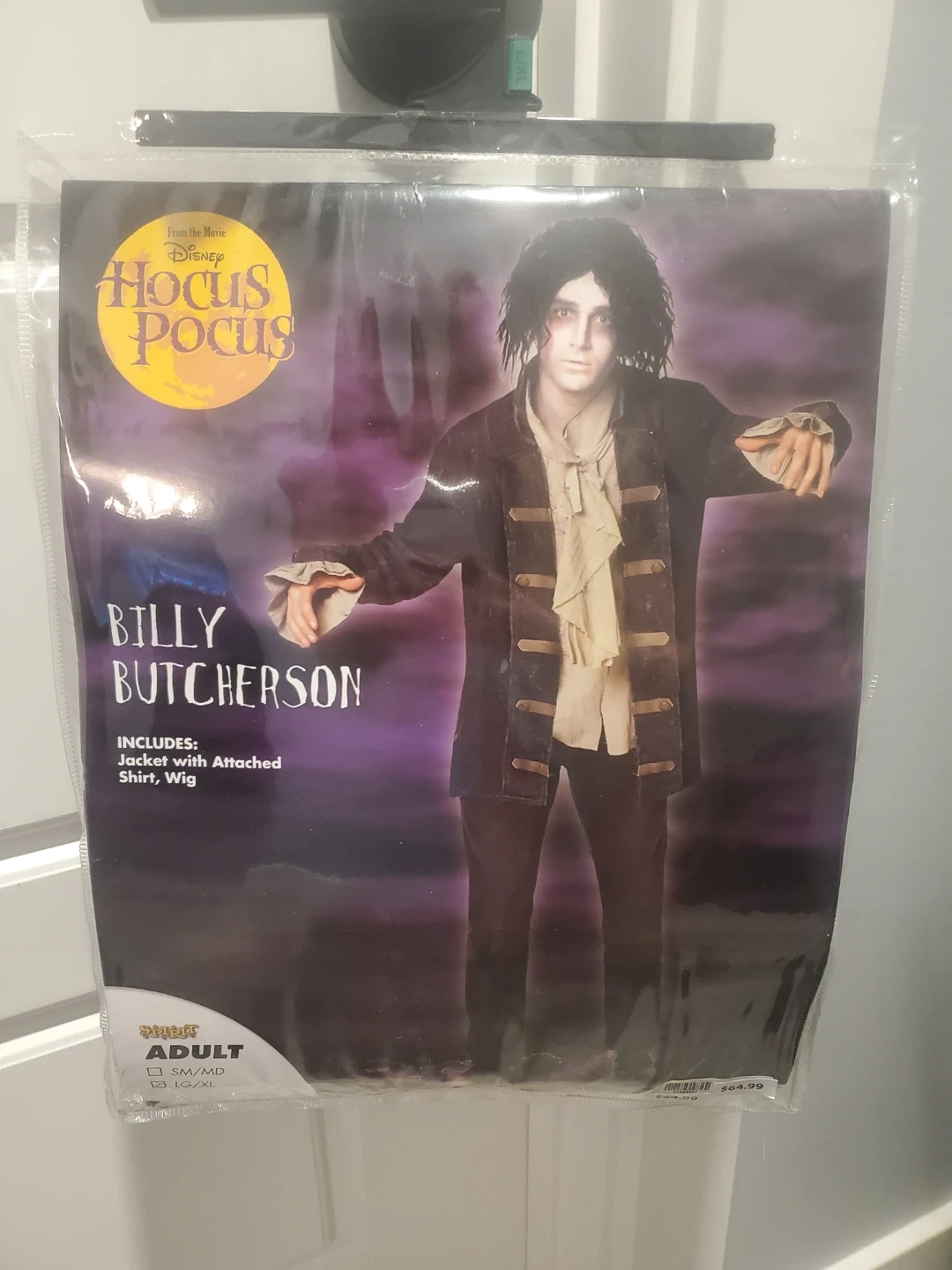 This Spirit Halloween costume is for the character Billy Butcherson from Disney's Hocus Pocus. It includes a jacket with an attached shirt and a wig. Available in adult sizes.