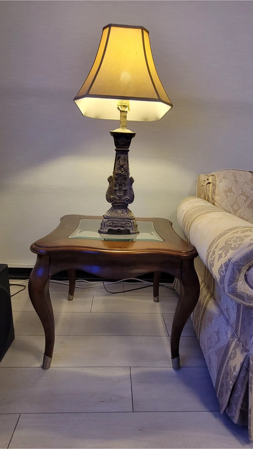 2X Side tables with a lamp. Perfect for adding a touch of elegance to any room! The table features a classic design with curved legs and a smooth top. The lamp provides a warm and inviting glow, perfect for reading or relaxing. No damage, smoke free pet free home.