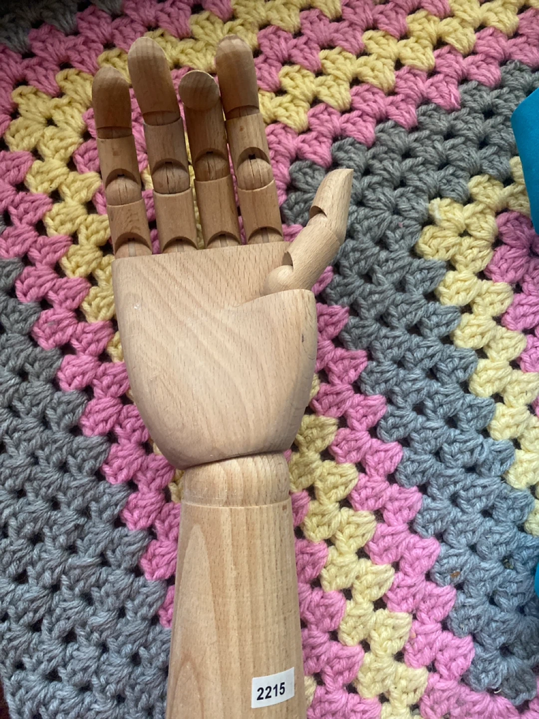 This is a wooden articulated mannequin hand. It's made of wood and has movable finger joints. It's useful for artists or display purposes.