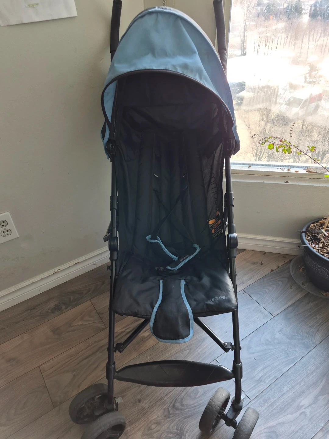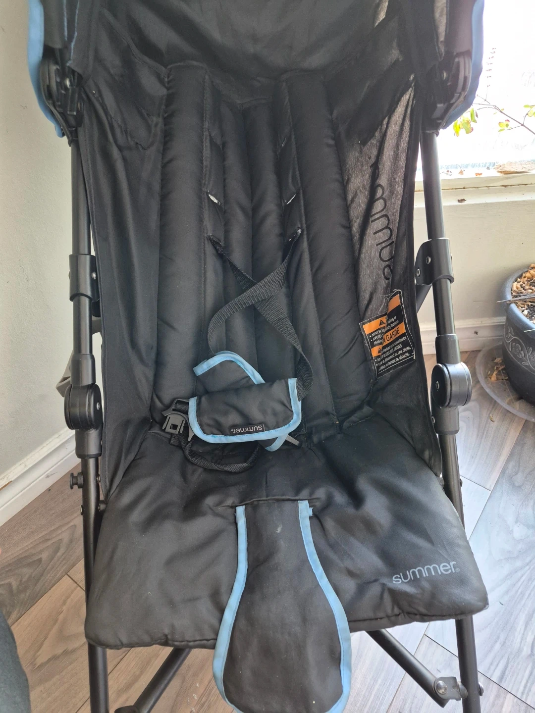 This is a blue and black Summer Infant lightweight stroller. It features a padded seat and harness for comfort. It's also equipped with a handy cup holder.