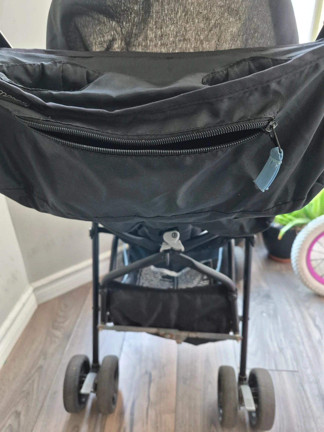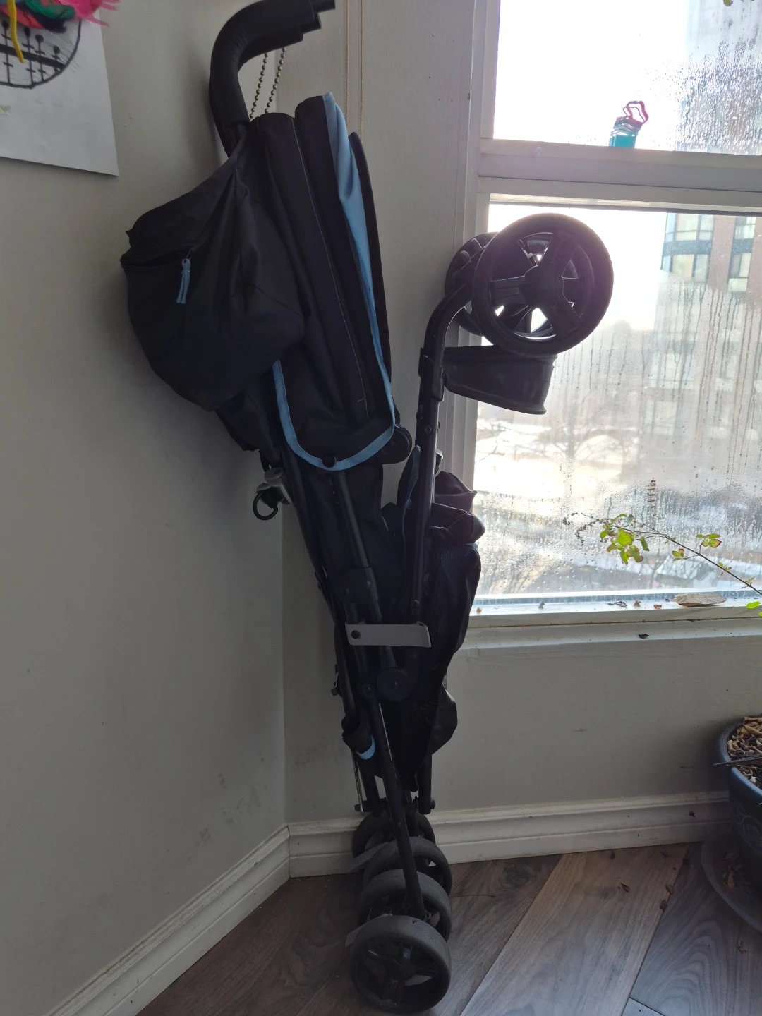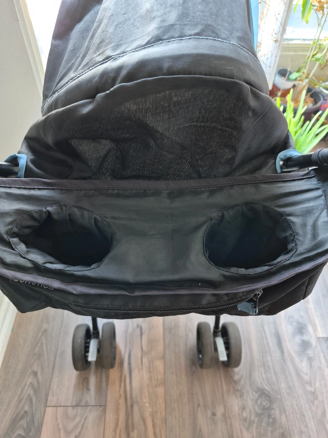 This is a blue and black Summer Infant lightweight stroller. It features a padded seat and harness for comfort. It's also equipped with a handy cup holder.