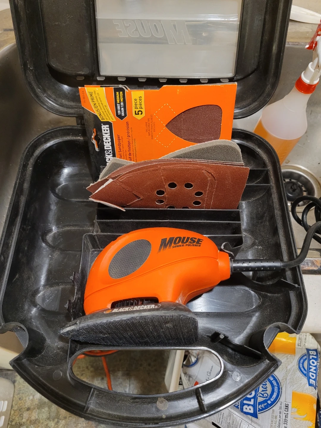 This is a BLACK+DECKER Mouse Sander/Polisher, perfect for detailed sanding and polishing tasks. It comes with a box of 5 pieces of 120-grit medium sandpaper. This tool is great for small projects and intricate areas.
