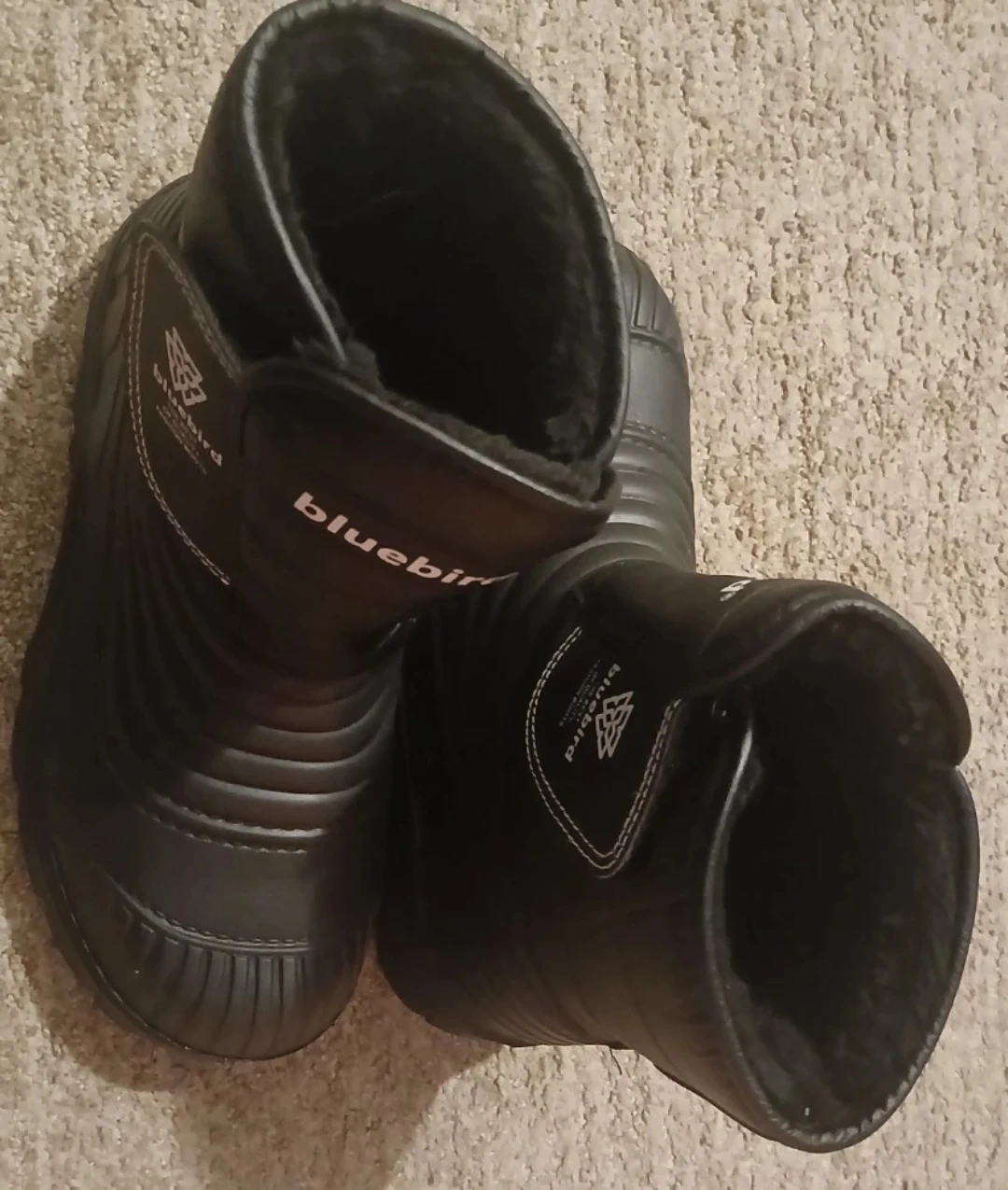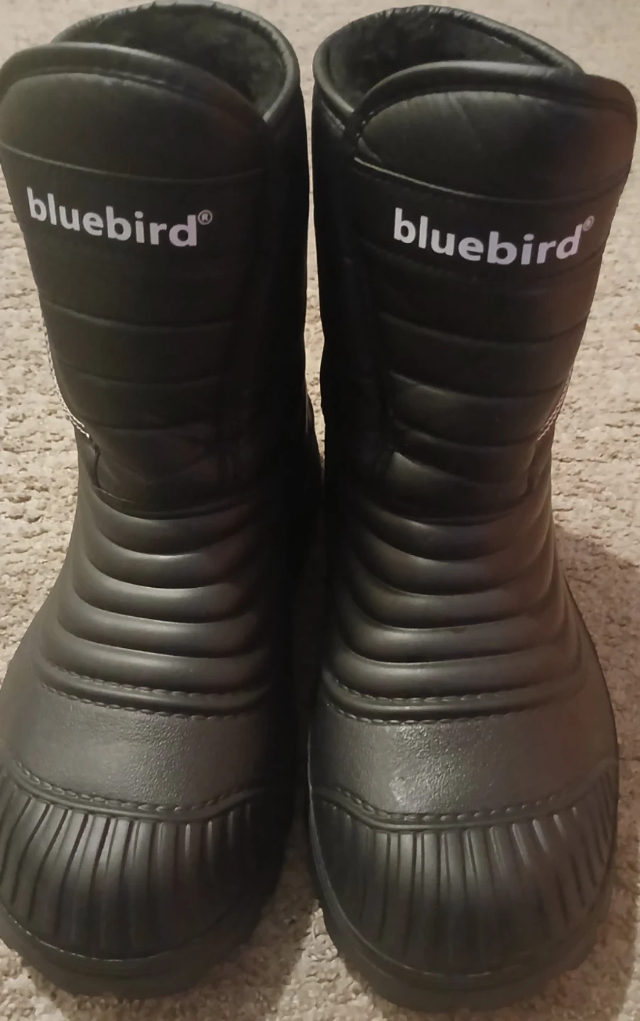 Keep your feet toasty warm in these Black Bluebird winter boots. They're lined with faux fur for extra comfort. The rubber soles provide good traction on slippery surfaces.Note it is rubber not leather very light and easy to walk around with bought this online and it's big for my feet love it but has to sell it .pickup only no delivery please from a pet free home.