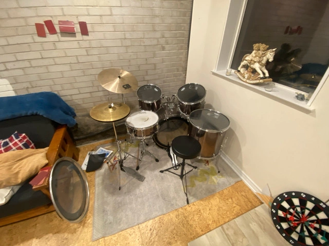 10This used drum kit includes a variety of drums and cymbals, perfect for beginners or experienced drummers looking for a compact set! This kit shows signs of use but is still in good playing condition. Here are some details: * Includes: Bass drum, snare drum, three toms, hi-hat cymbals and crash cymbal * Includes stands for cymbals and drums, drum throne, as well as drum sticks and music books. Feel free to message if you have any questions!