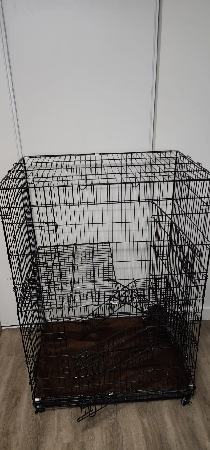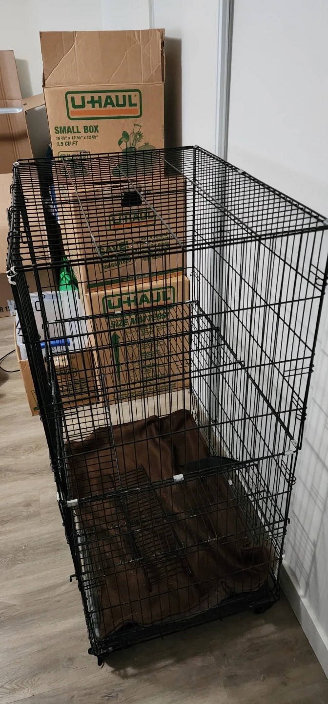 This is a black metal cat crate with a removable divider. It folds flat for storage and includes an easy clean plastic tray. Room for litter box It's great for containing your pet.