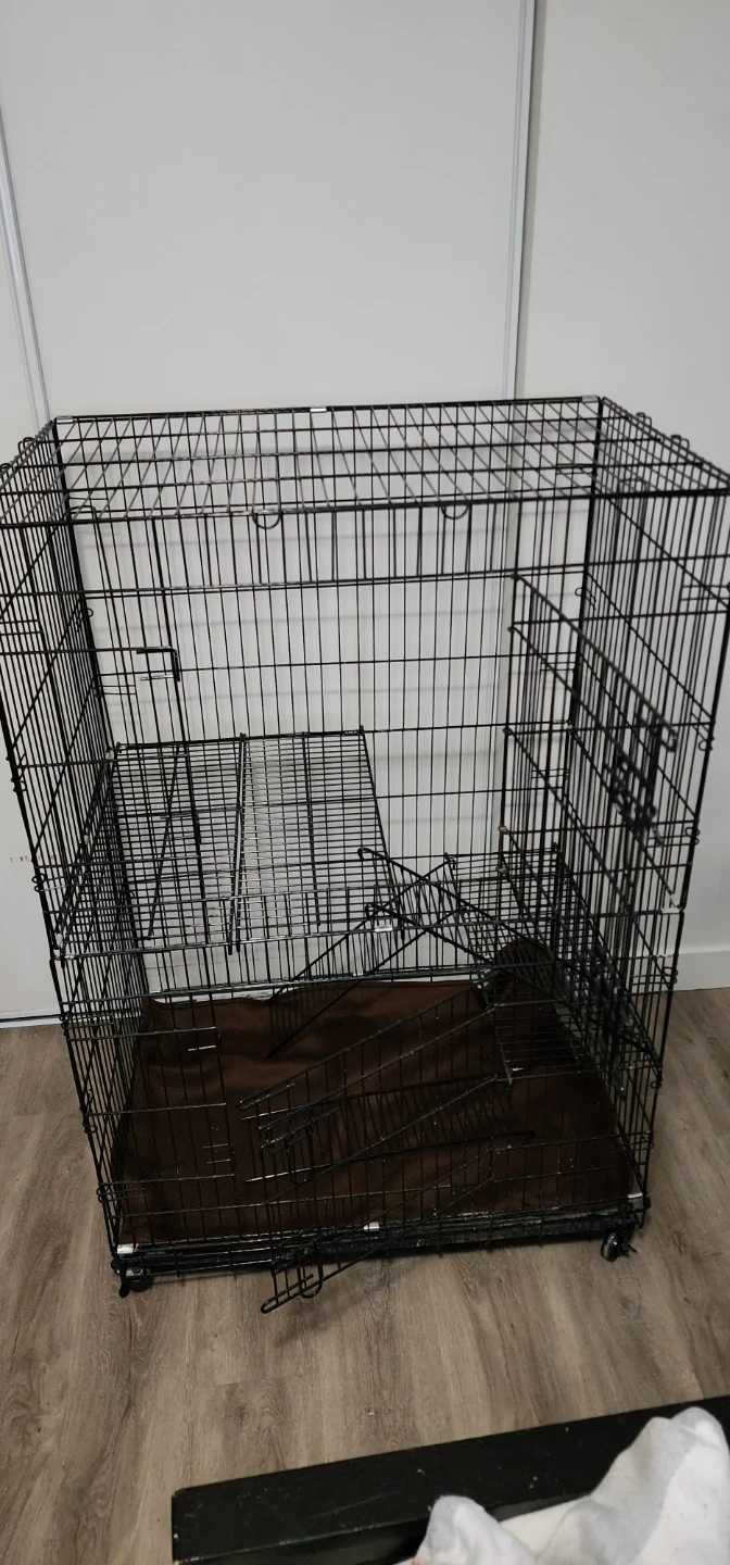 This is a black metal cat crate with a removable divider. It folds flat for storage and includes an easy clean plastic tray. Room for litter box It's great for containing your pet.