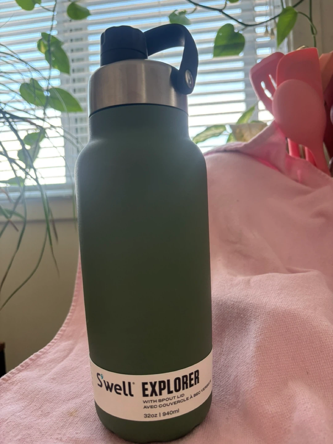 This is a Swell Explorer water bottle with a scout lid. It holds 32oz or 940ml. The bottle is stainless steel and comes in a nice green colour.