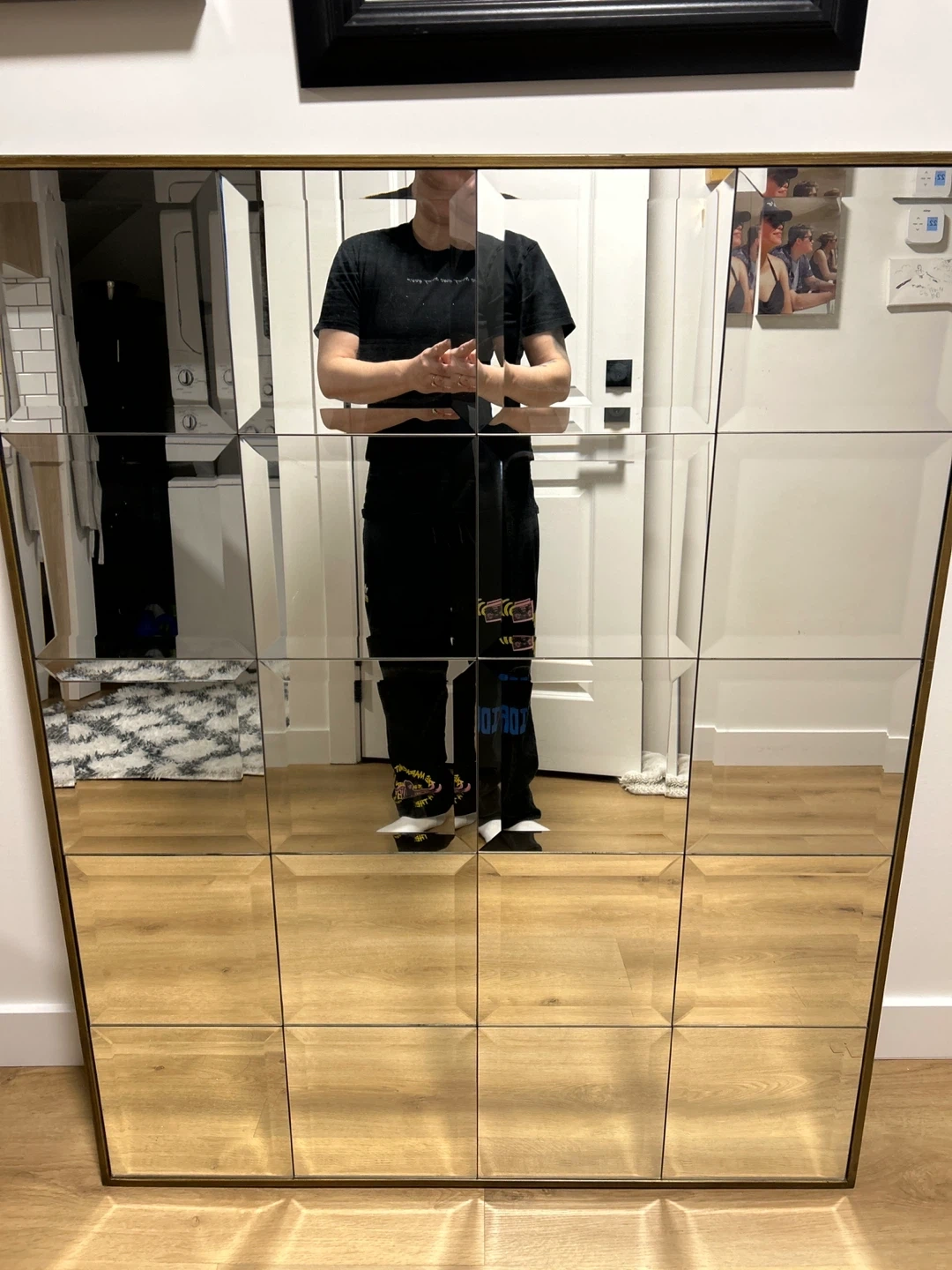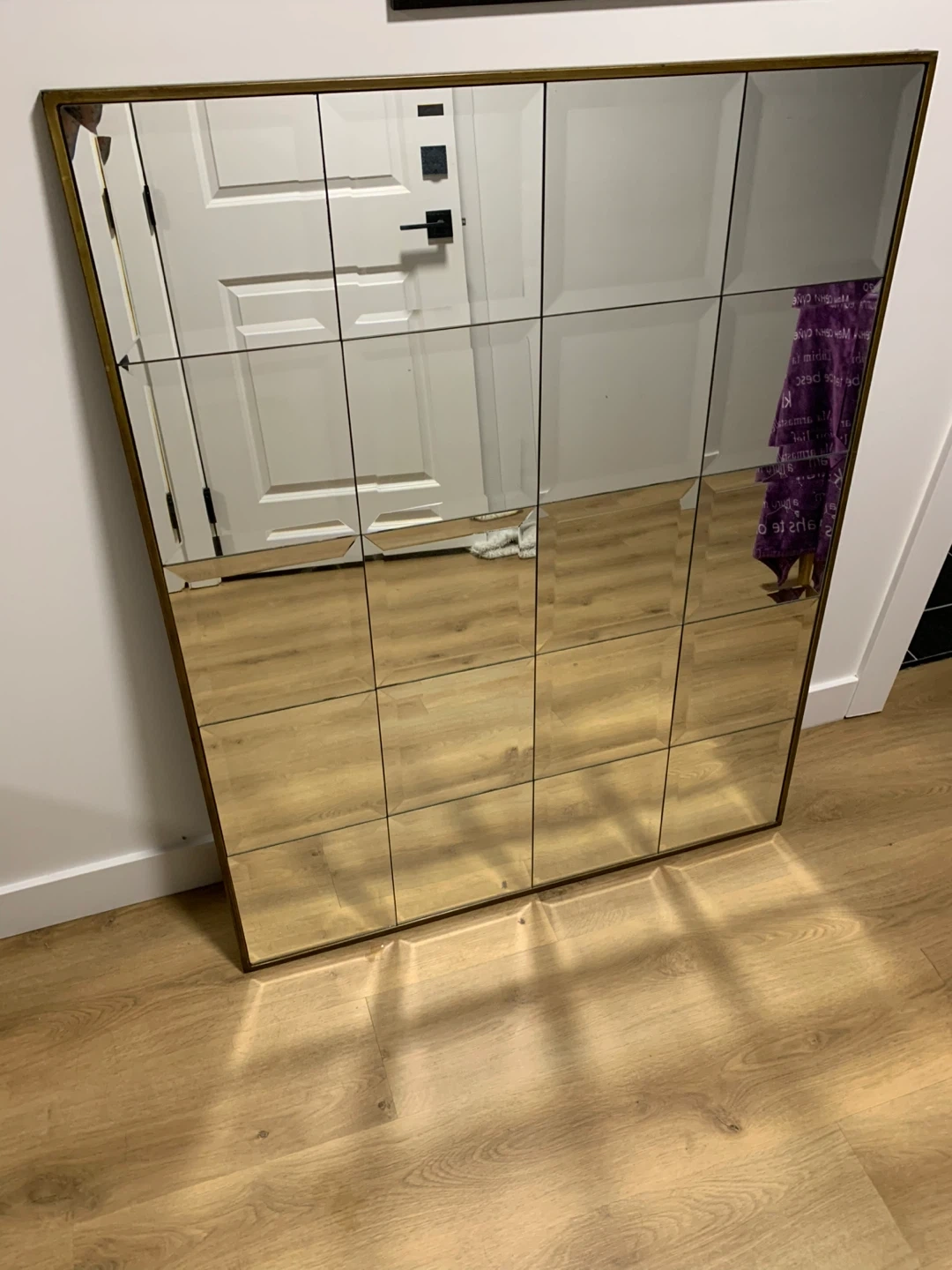 A decorative wall mirror with a gold-toned frame. It features a segmented mirrored surface, creating a unique visual effect.