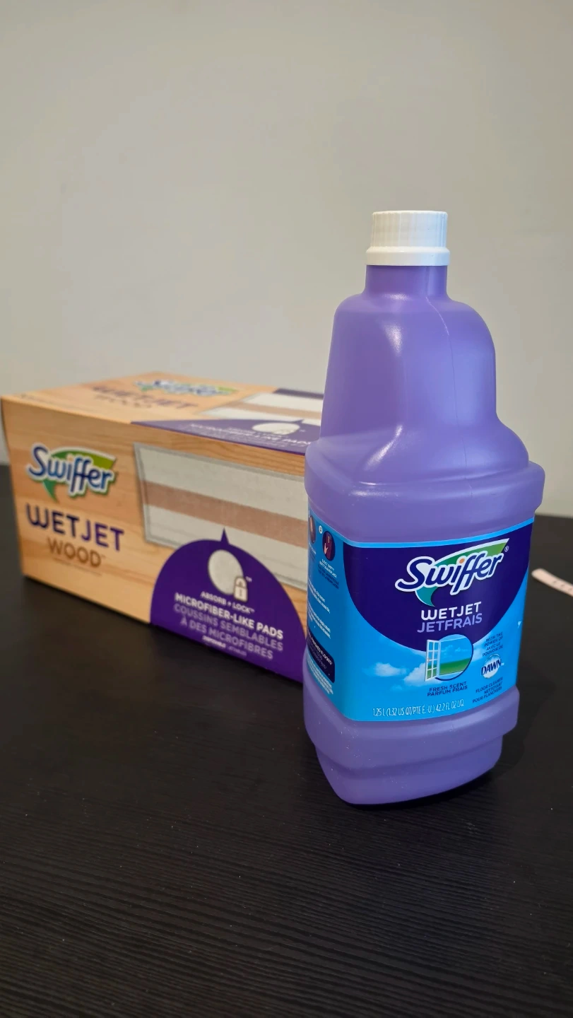 Swiffer WetJet Wood floor cleaning solution in a fresh scent. Includes microfiber-like pads with Absorb+Lock technology (7 pieces only). The cleaning solution is 1.25 L.