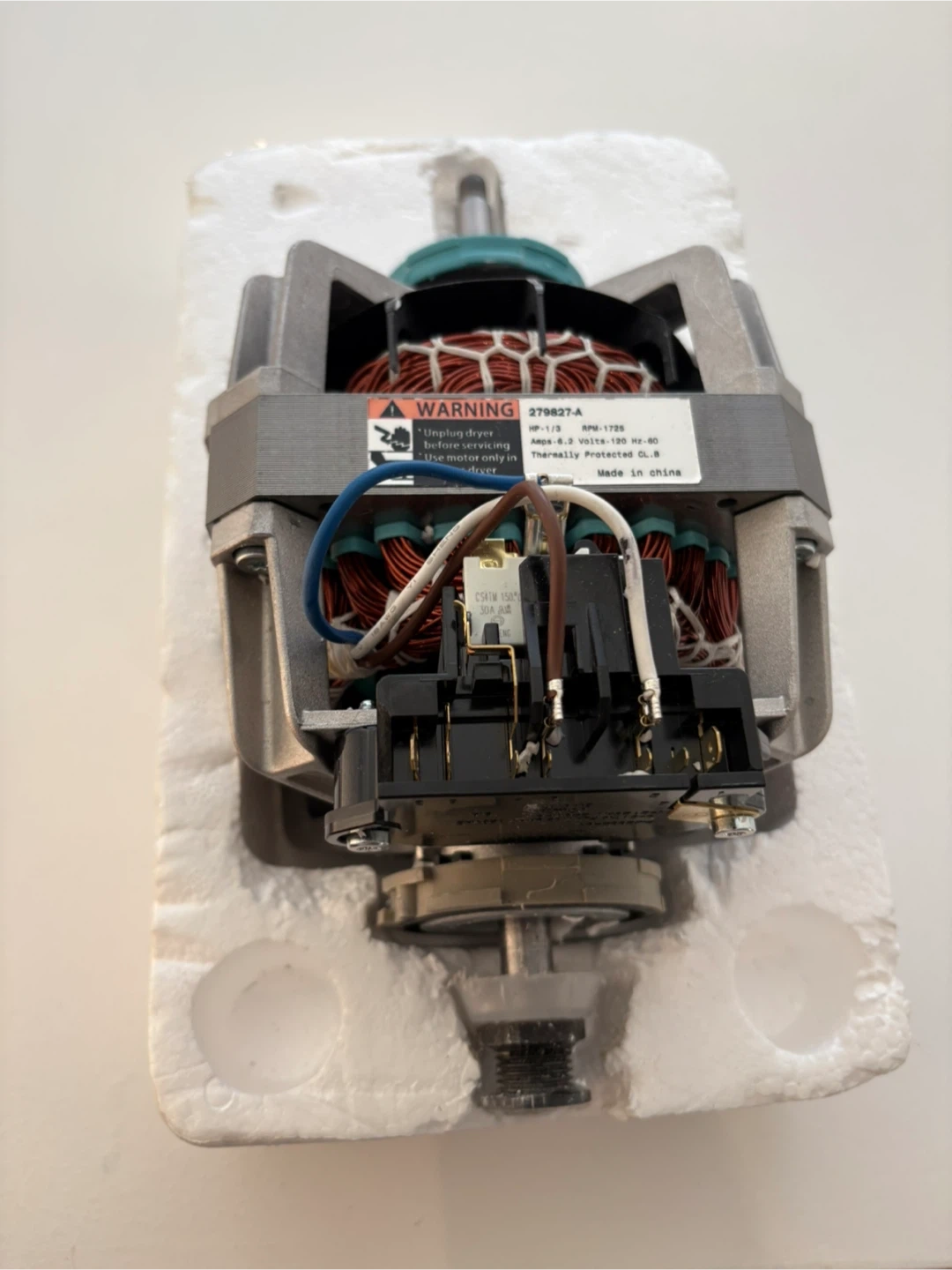 Selling a dryer motor, model 279827-A. It's a 1/3 HP motor running at 1725 RPM, 6.2 Amps, 120 Volts, 60 Hz and is thermally protected.